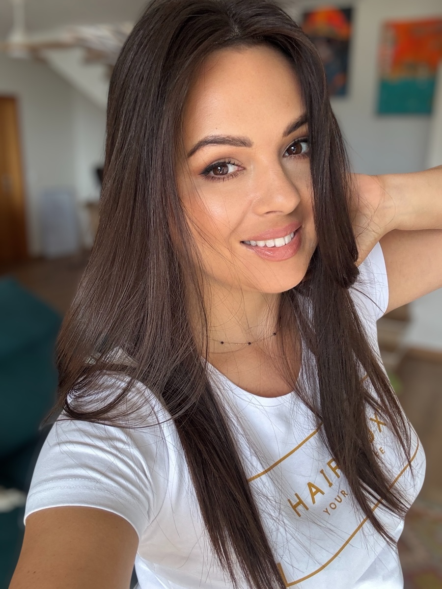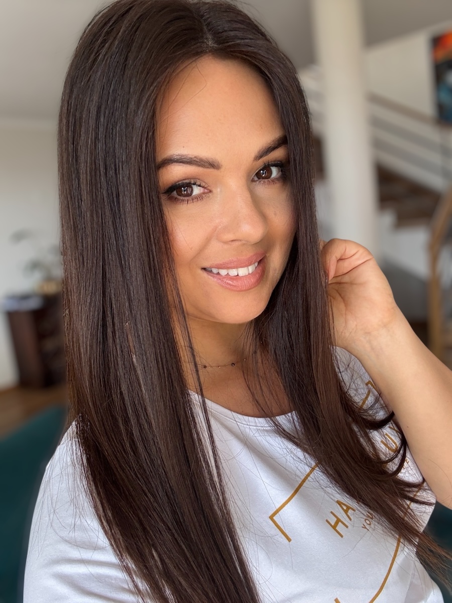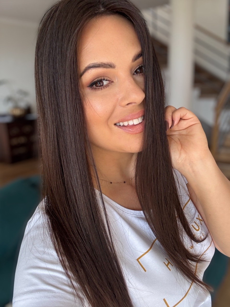 Włosy o długości 45 cm pozwalają na swobodne stylizacje – zarówno w wersji rozpuszczonej, jak i w lekkich upięciach. Ciemny brąz to klasyczny, głęboki odcień, który doskonale komponuje się z naturalnym kolorem włosów, dodając fryzurze gęstości i świeżości bez efektu sztuczności.