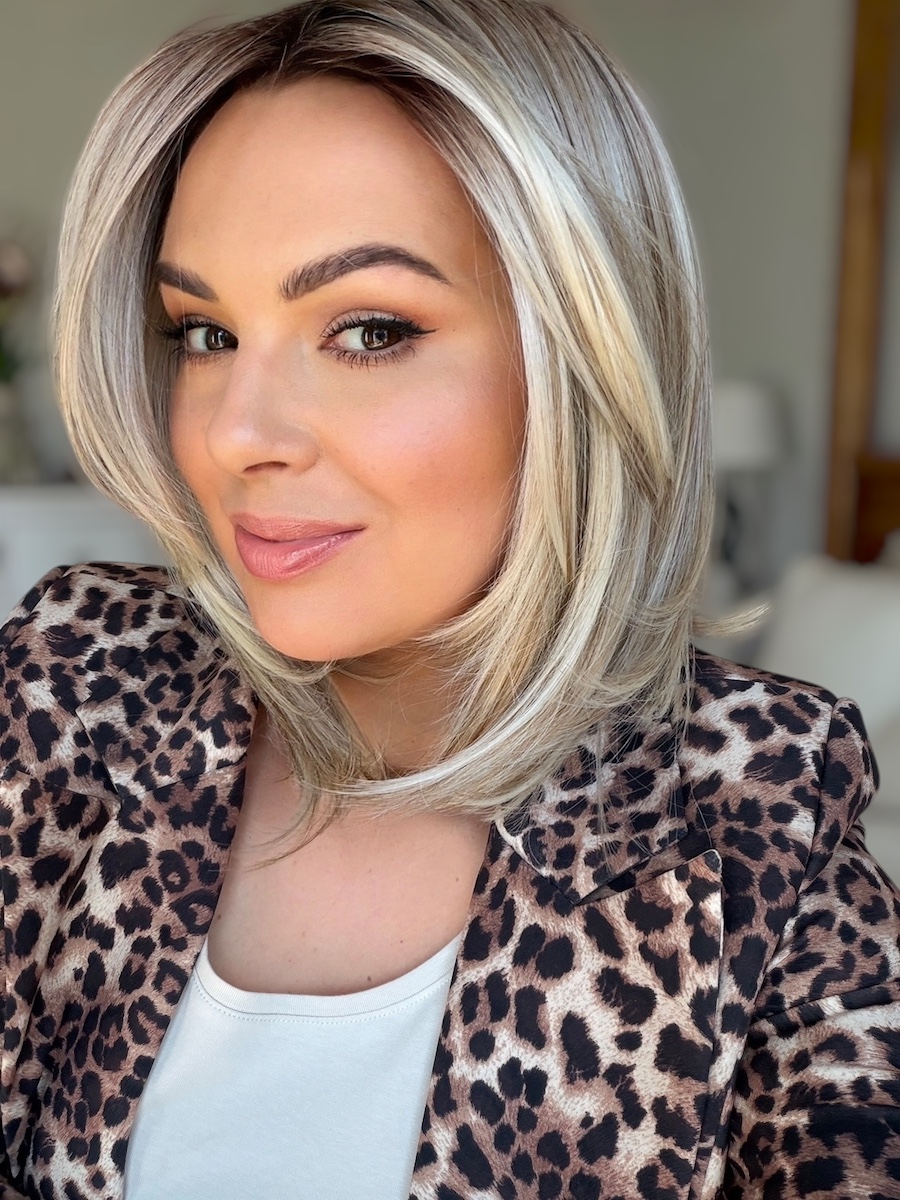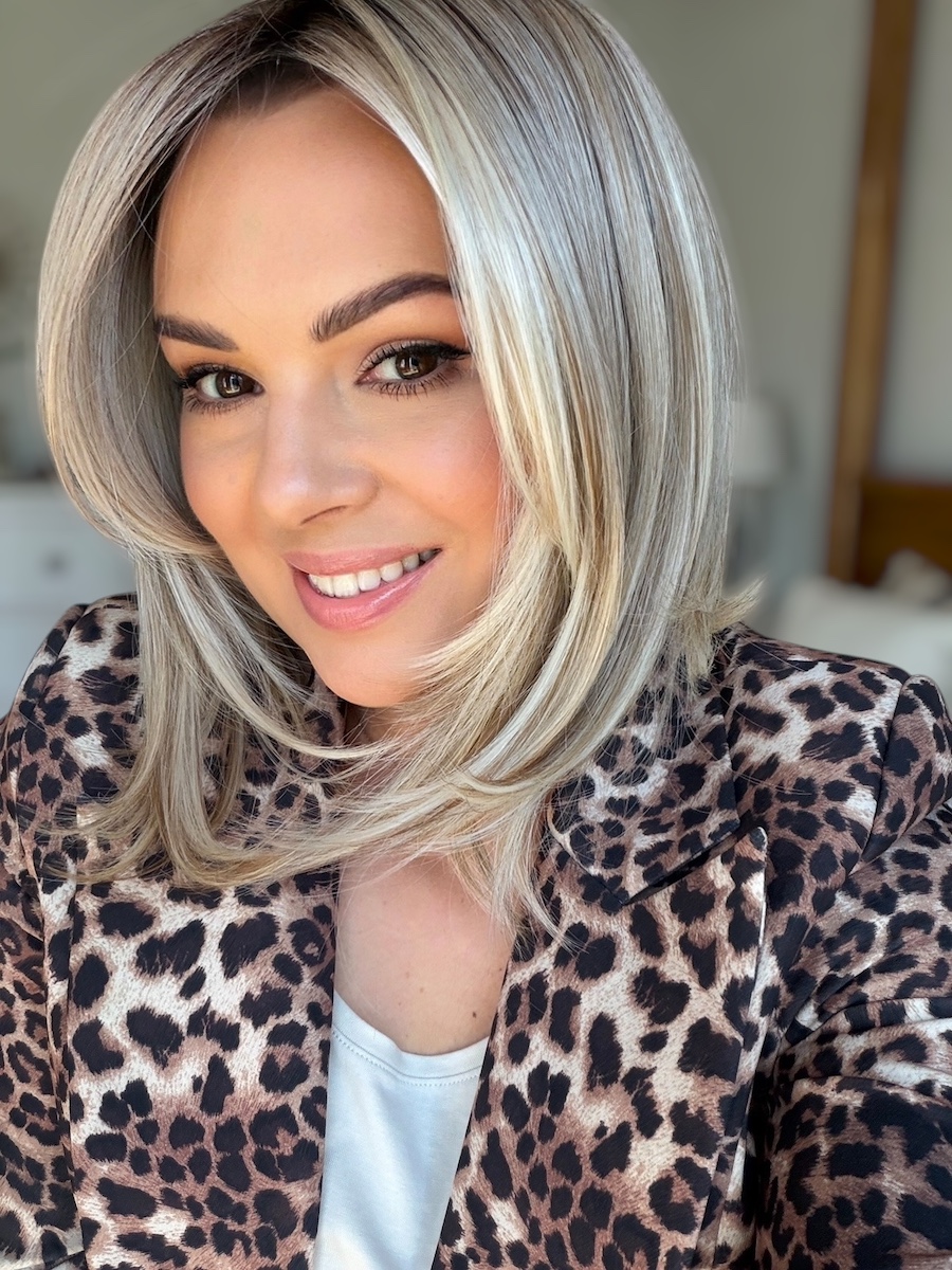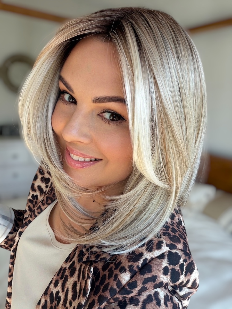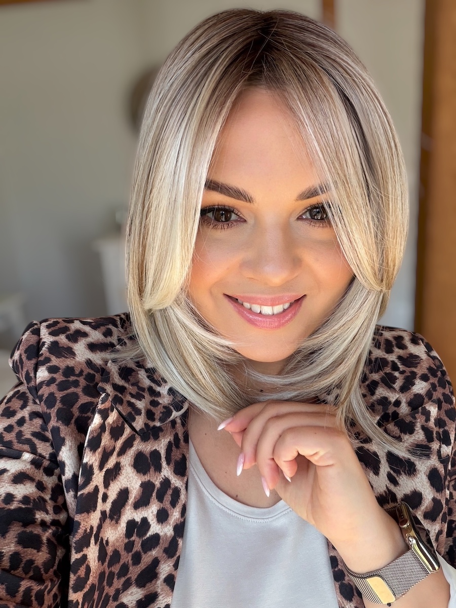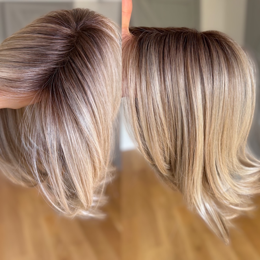 Kolor: baleyage chłodny blond z odrostem, butterbeer blonde