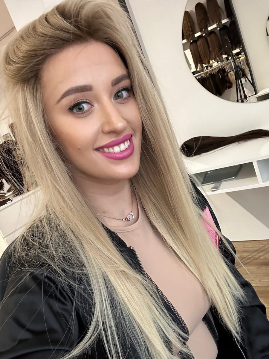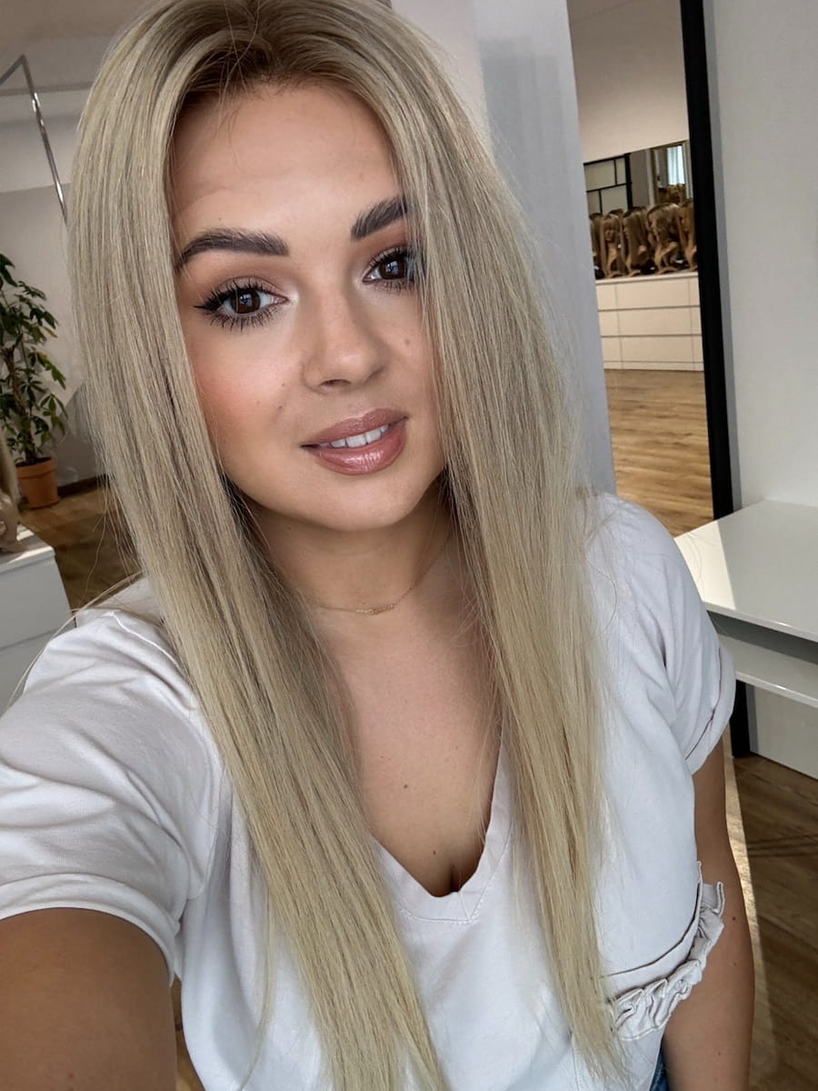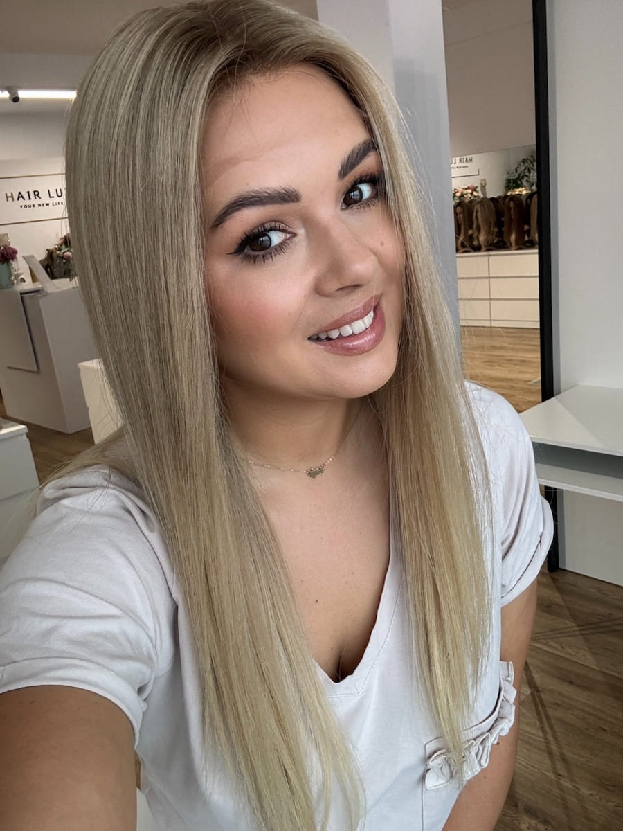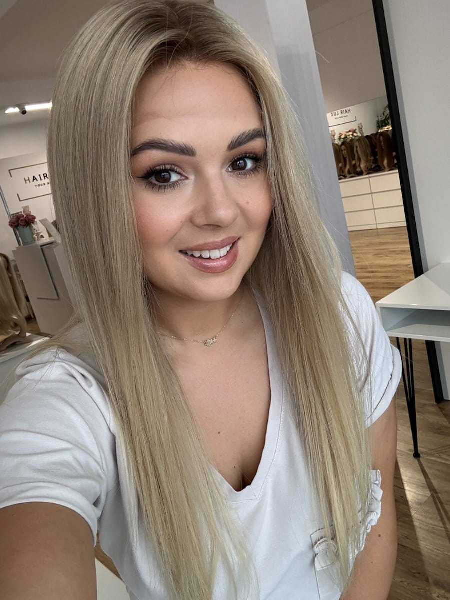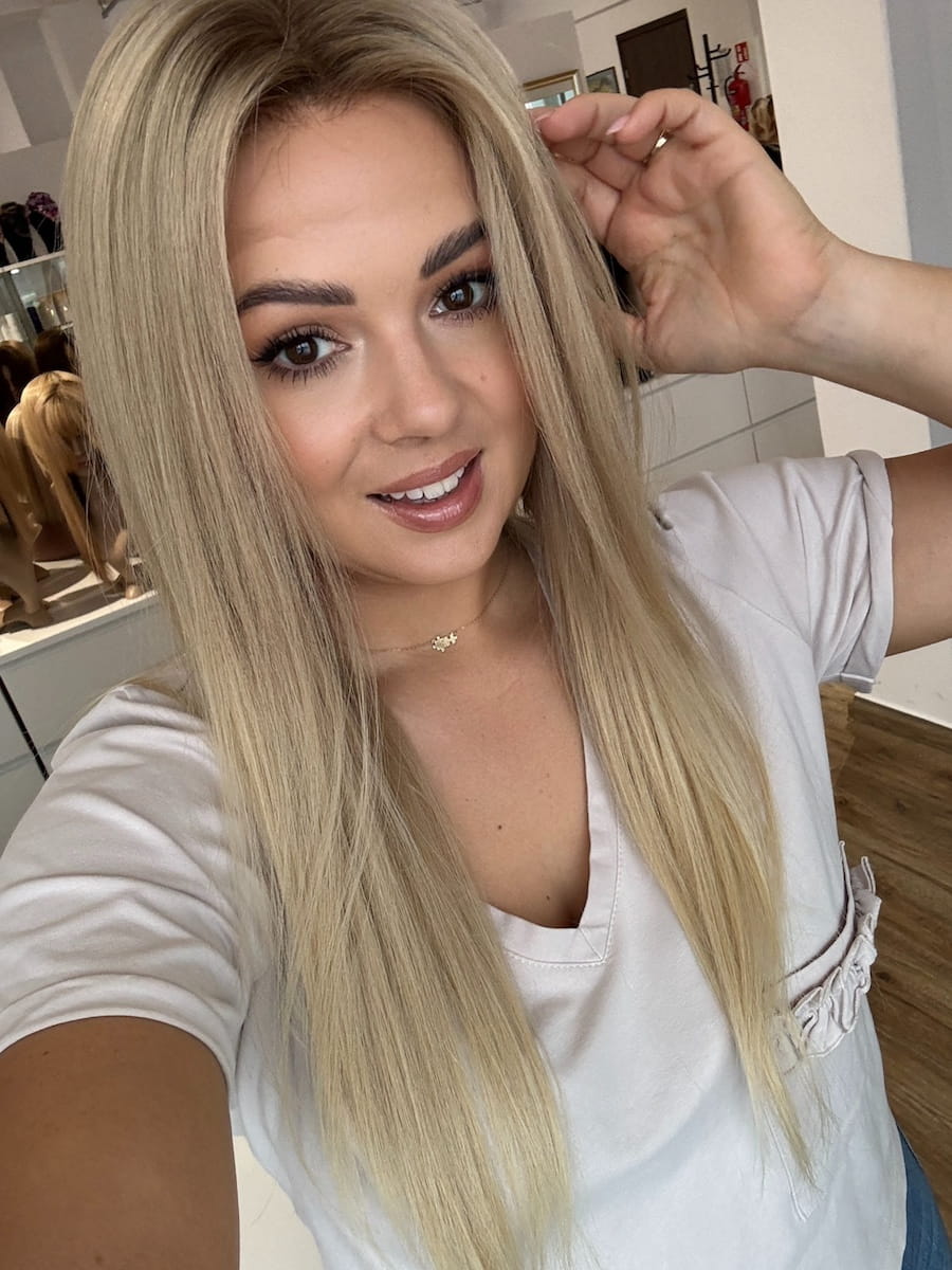Kolor: Beżowy naturalny blond z delikatnym odrostem.