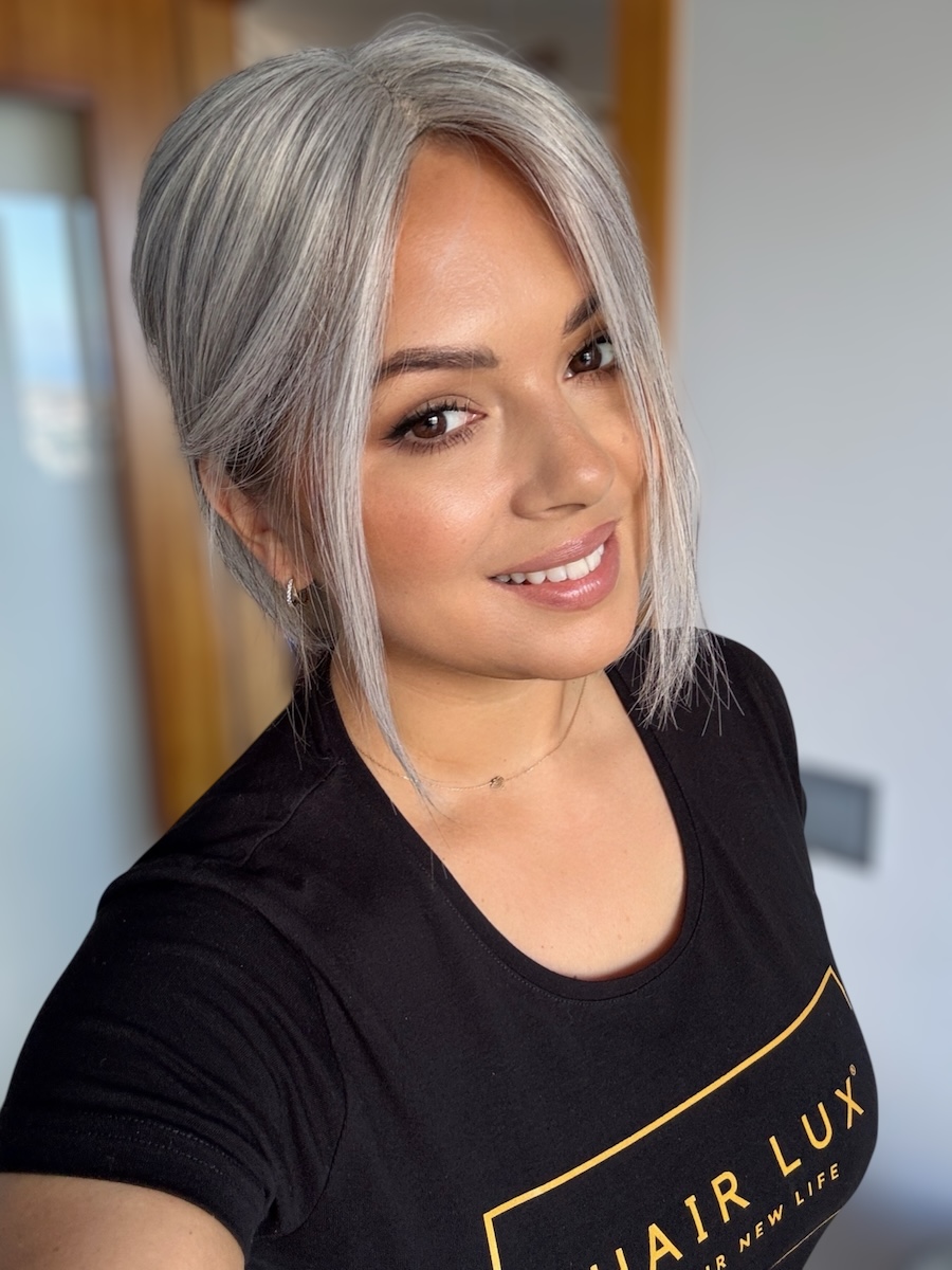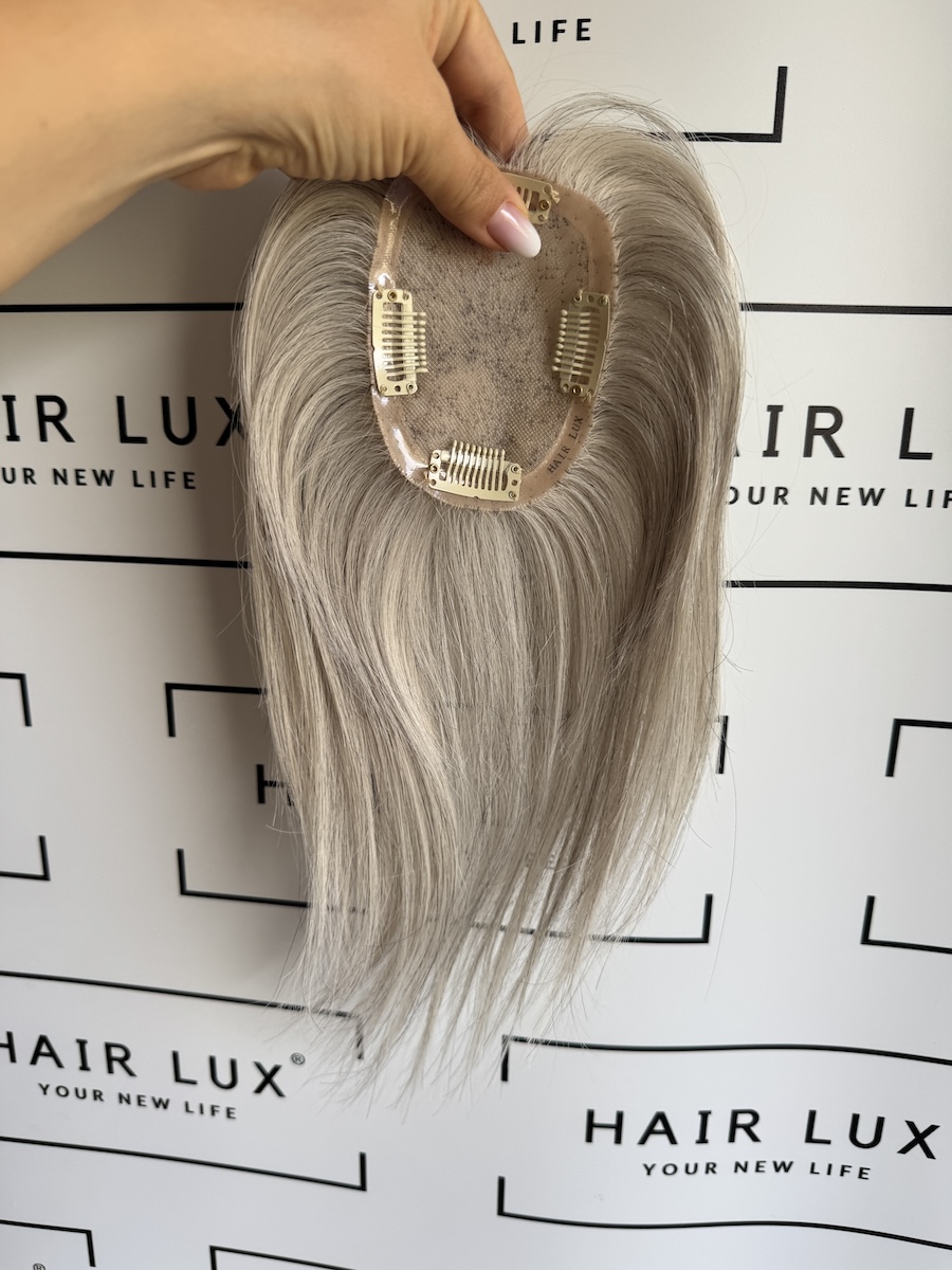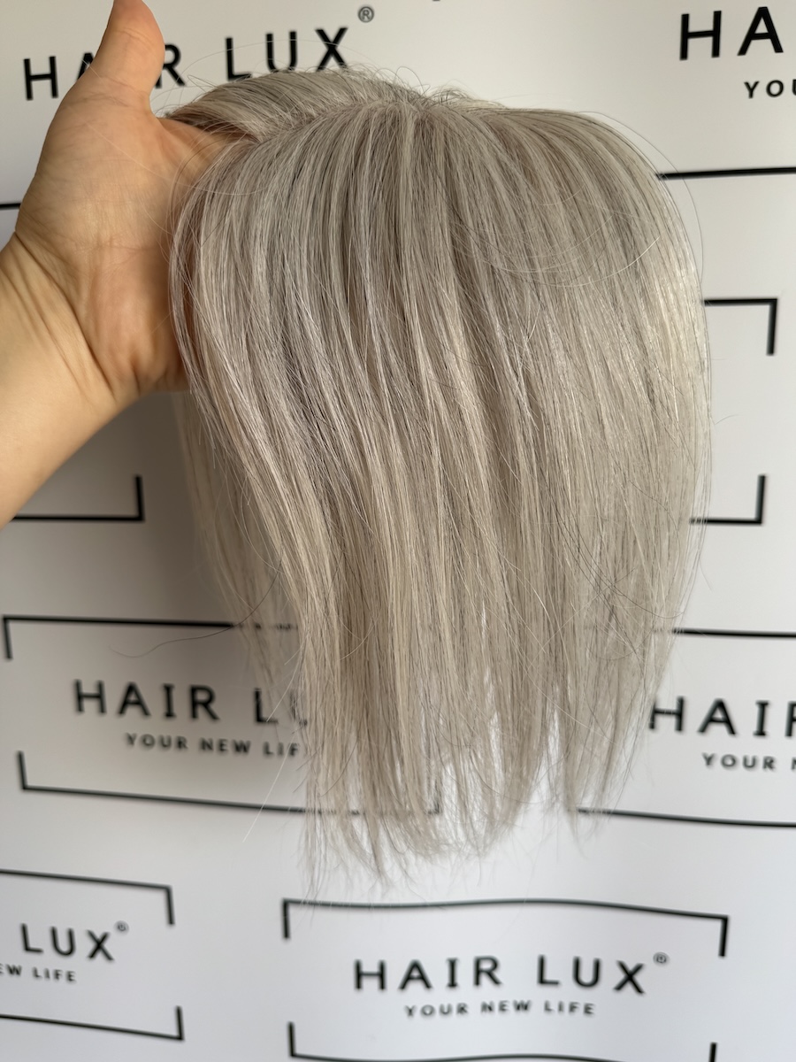 Szukasz naturalnego sposobu na dodanie objętości i blasku swoim włosom? Nasz mini topper w kolorze jasny siwy mieszany z ciemnymi włosami to idealne rozwiązanie! Dzięki niewielkiej bazie o wymiarach 8x10 cm oraz delikatnemu zagęszczeniu, topper doskonale sprawdzi się do subtelnych upięć oraz codziennego noszenia.