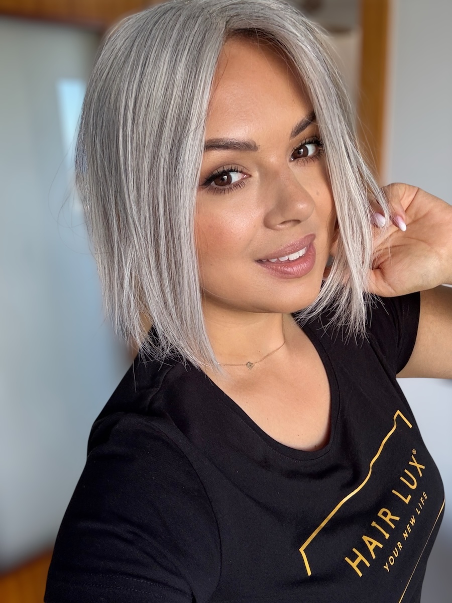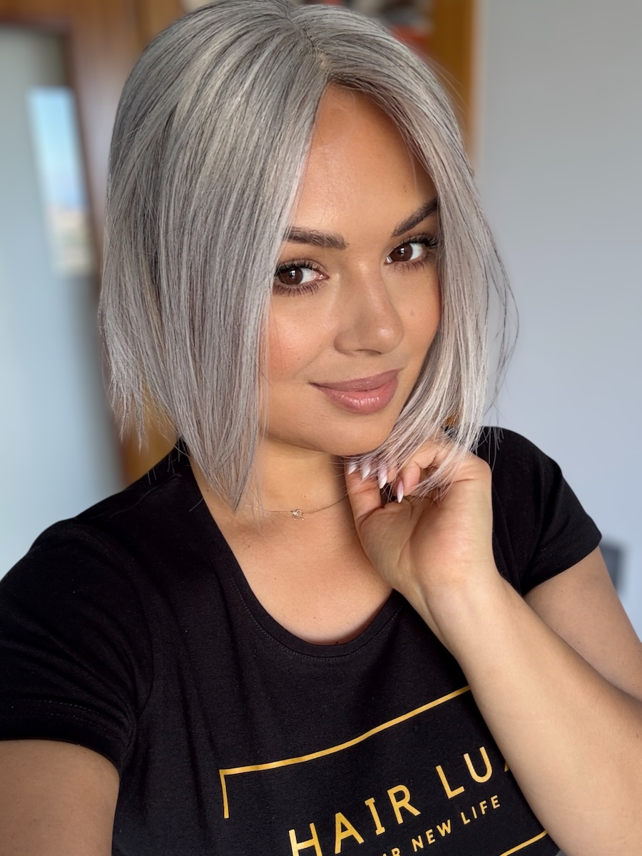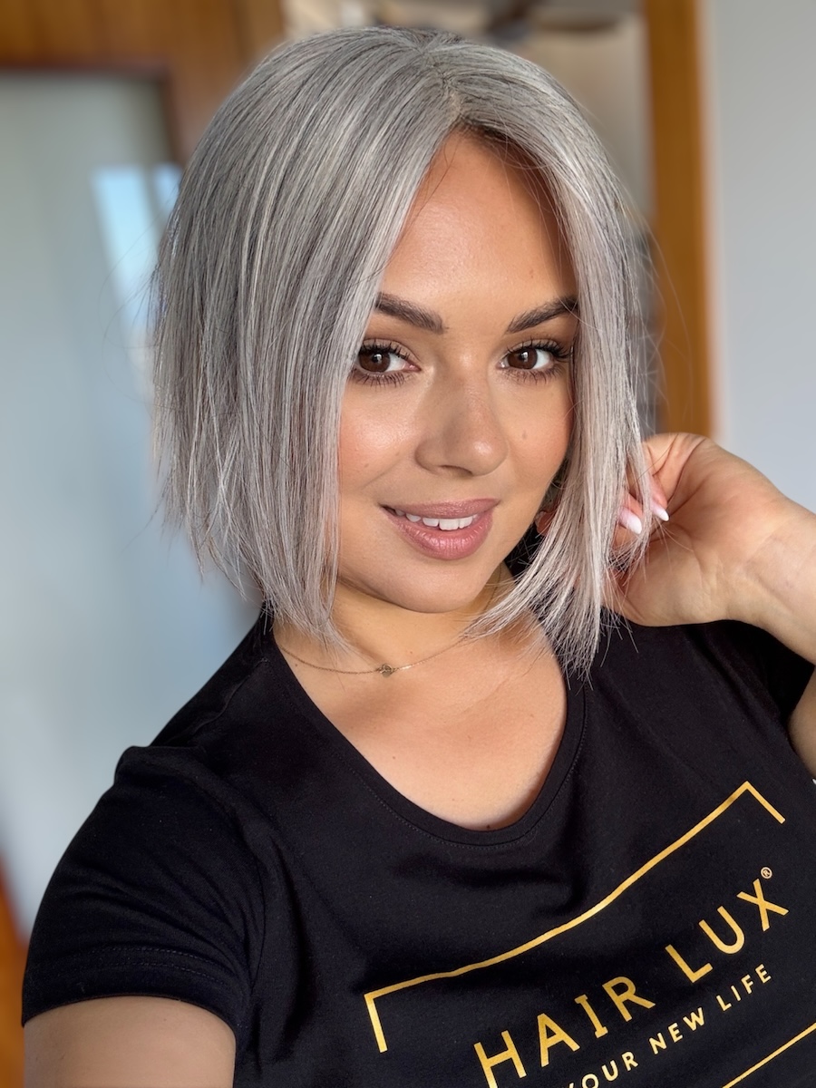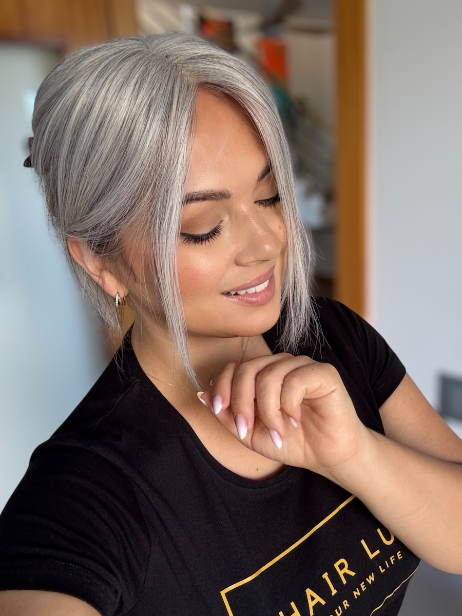 Szukasz naturalnego sposobu na dodanie objętości i blasku swoim włosom? Nasz mini topper w kolorze jasny siwy mieszany z ciemnymi włosami to idealne rozwiązanie! Dzięki niewielkiej bazie o wymiarach 8x10 cm oraz delikatnemu zagęszczeniu, topper doskonale sprawdzi się do subtelnych upięć oraz codziennego noszenia.