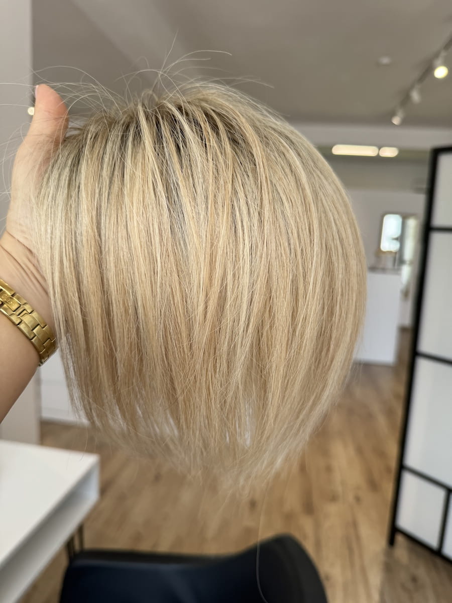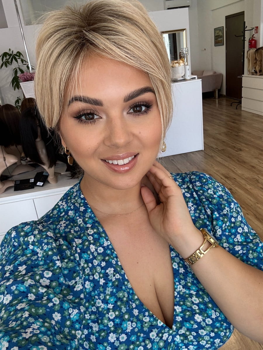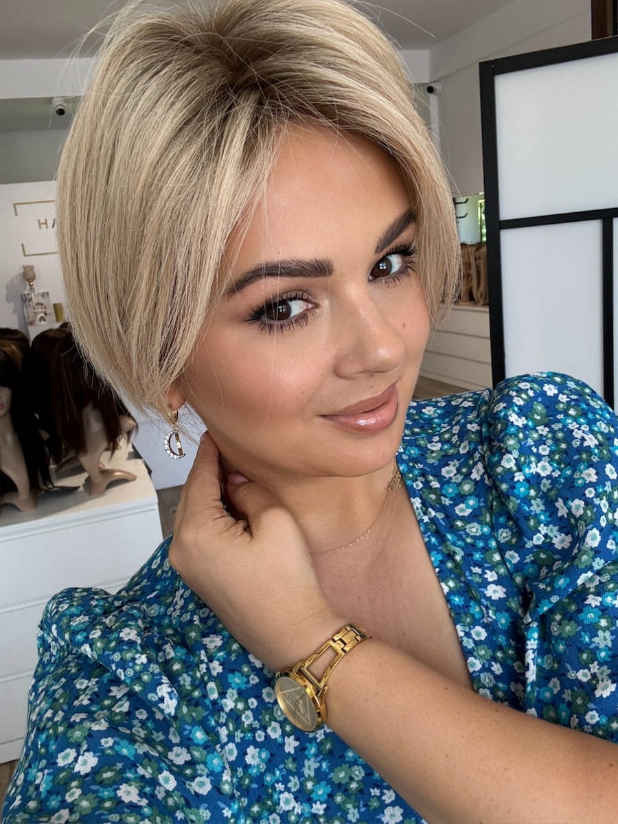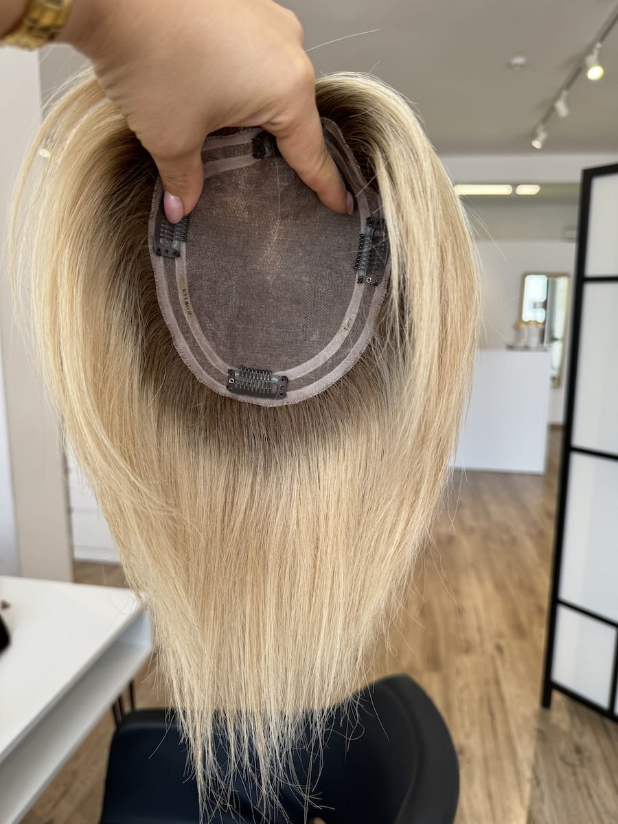 Prezentowany topper słoneczny blond pozwoli Ci na eksperymentowanie z fryzurą. Możesz ją dowolnie kręcić i prostować (max temp. 160-170 stopni), a także swobodnie upinać, gdyż tupet został wykonany z wysokiej jakości włosów europejskich, które stanowią doskonały zagęszczacz. Topper wystarczy zapiąć do swoich włosów około 1 cm od początku przedziałka – tym sposobem uzyskamy najbardziej naturalny efekt.