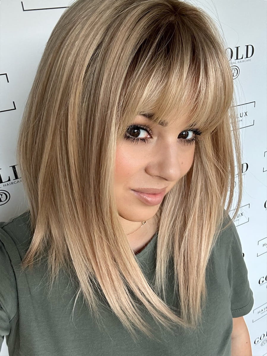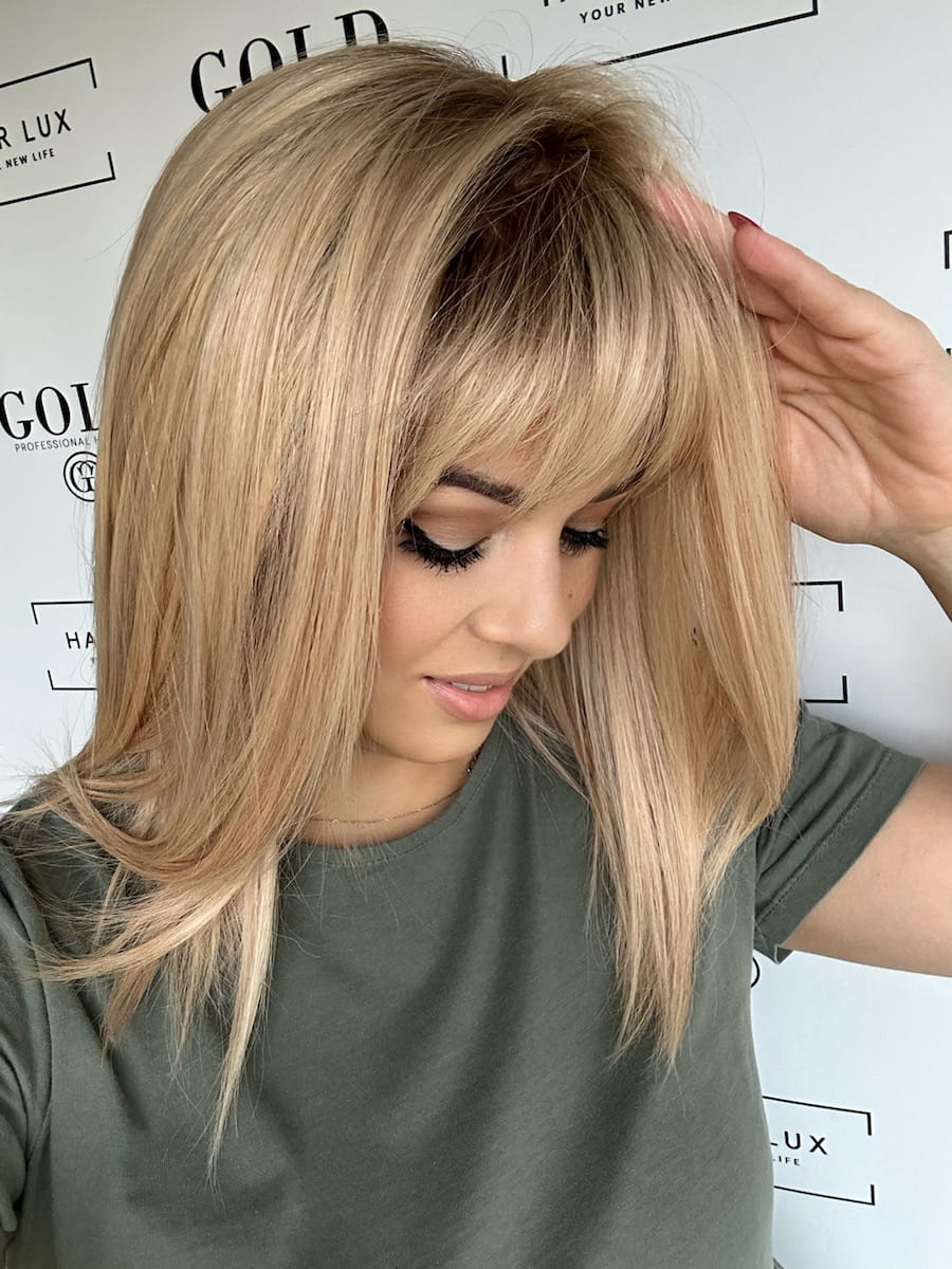 Rita silk 35 M z grzywką perukanaturalna ciepły blond baleyage