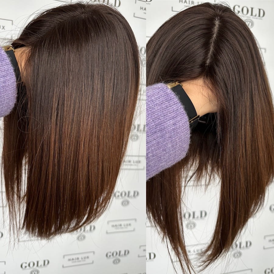 Long Bob Lucy II 35 cm M sillk z grzywką peruka naturalna ciemny brąz ombre