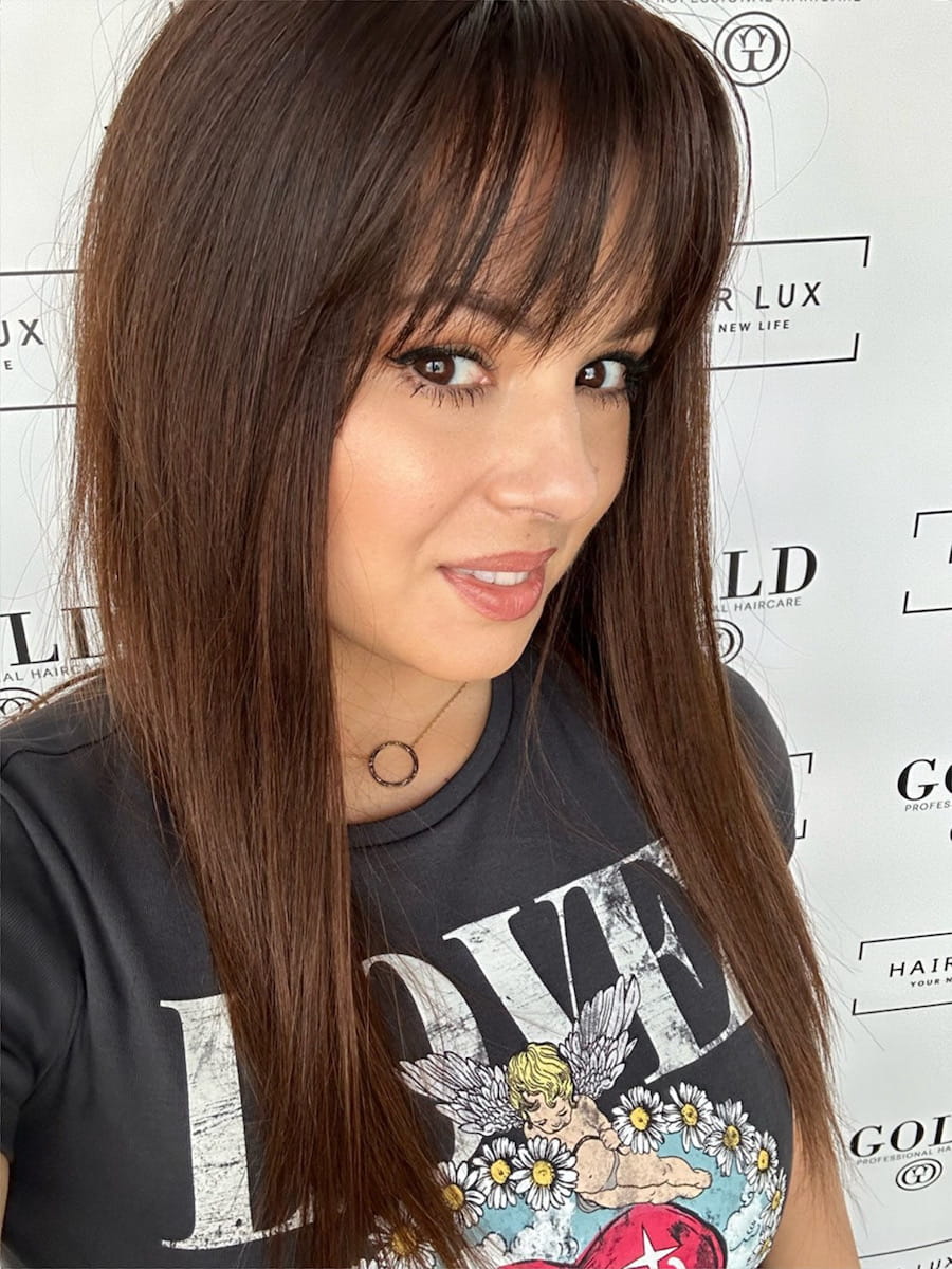 Lucy II 40cm S silk z grzywką peruka naturalna ombre ciemny brąz