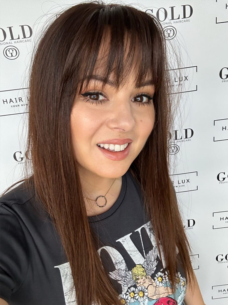 Lucy z grzywką 35 cm S silk peruka naturalna ombre brąz