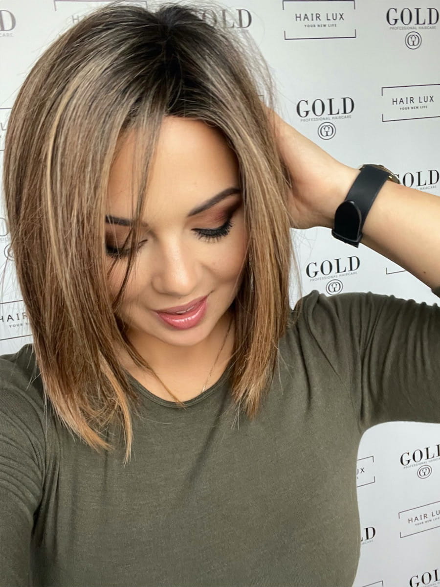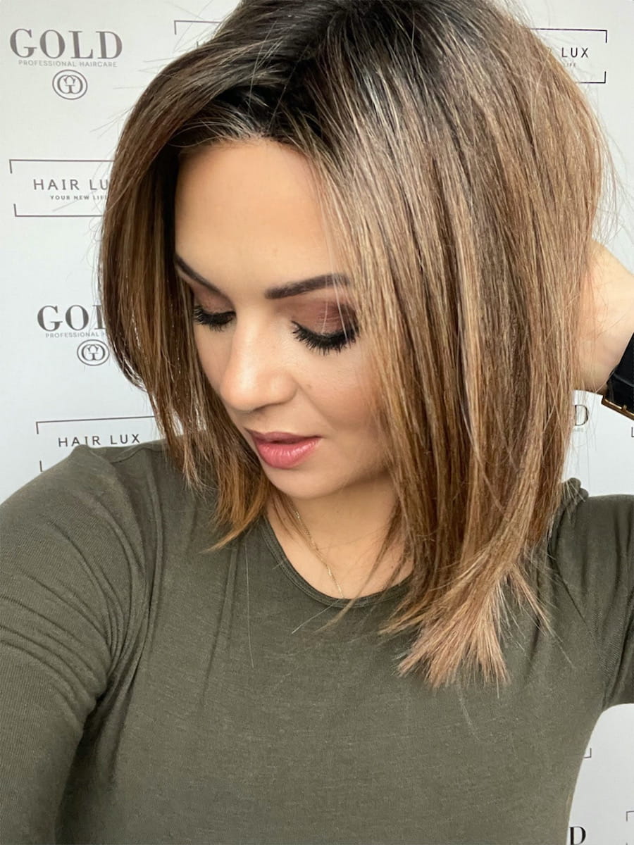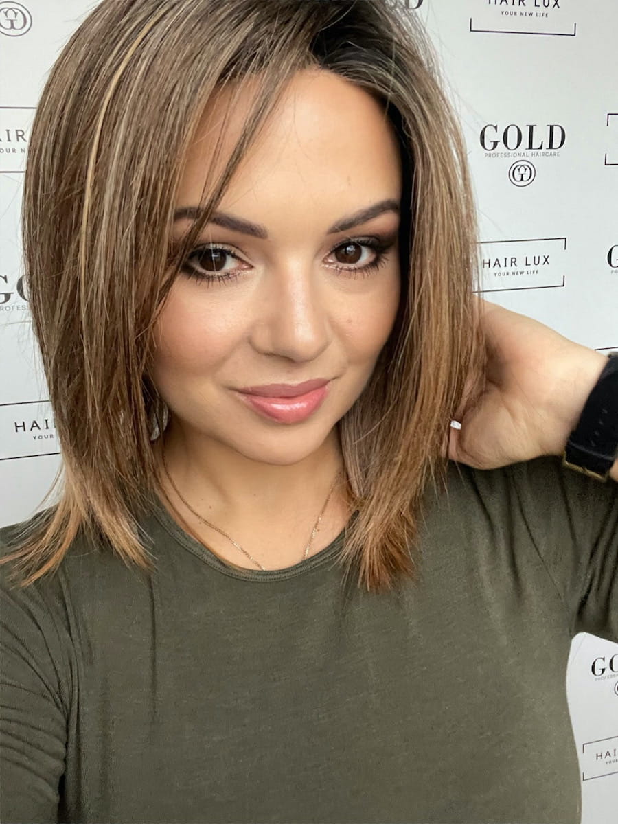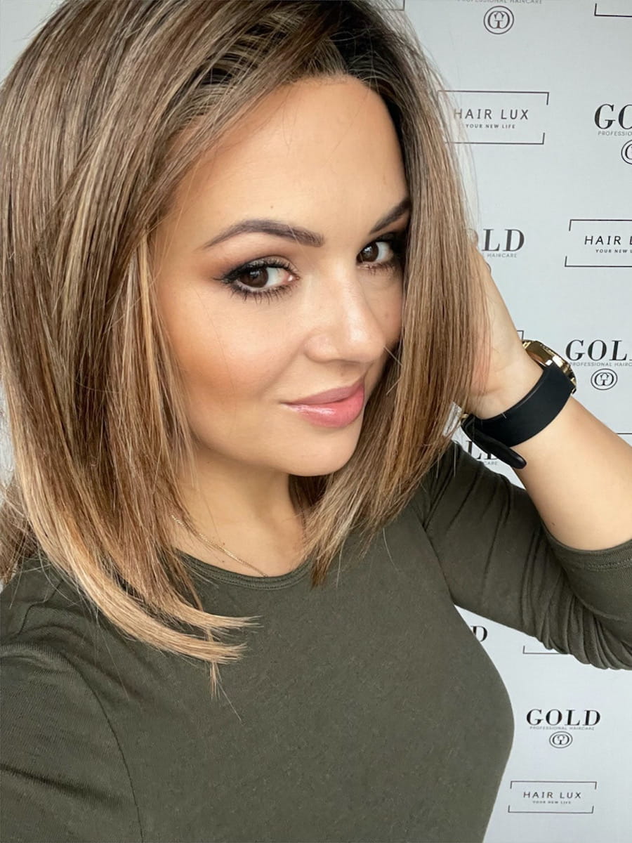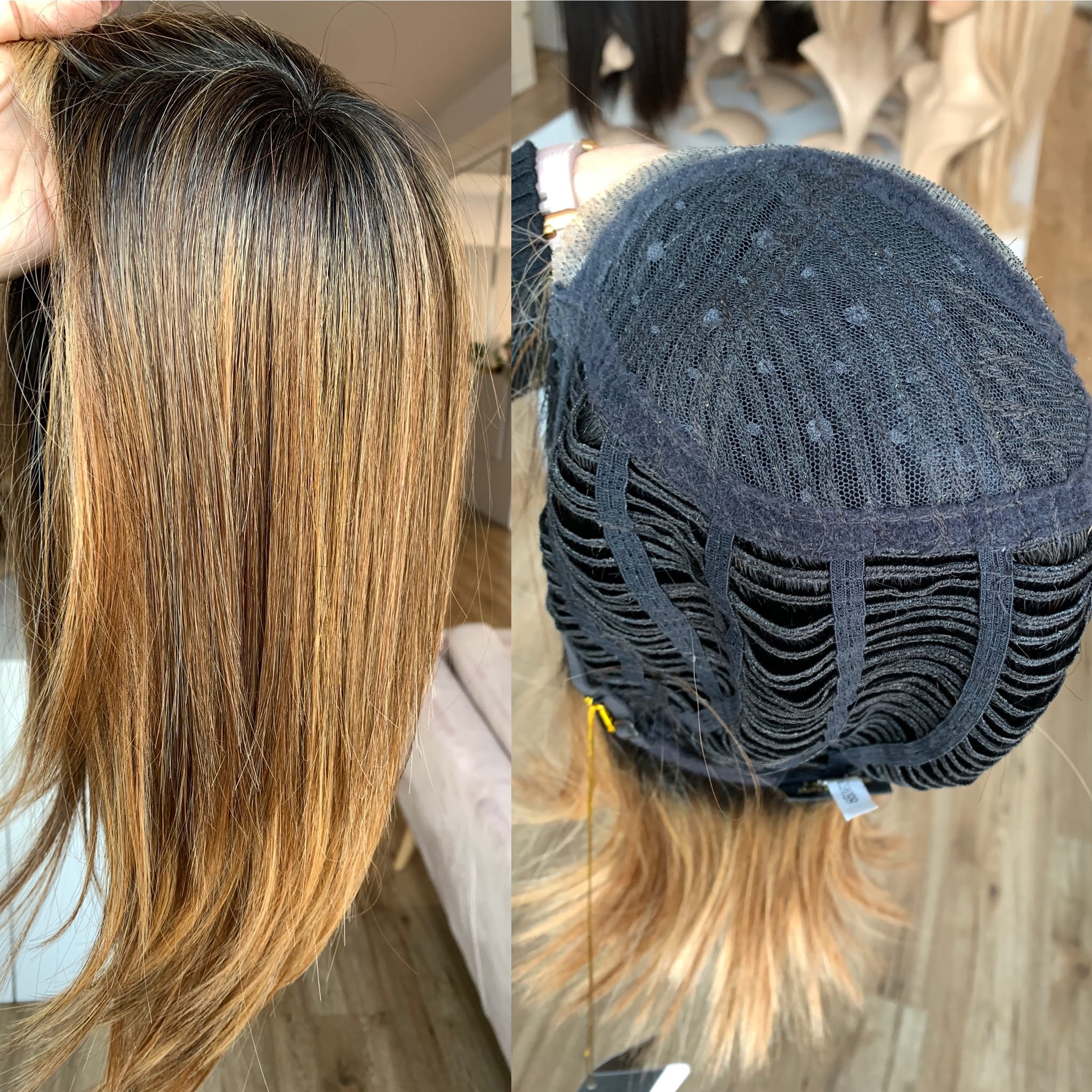 Modna fryzura, włosy proste pocieniowane . Peruka po umyciu i samoistnym wyschnięciu powraca do pierwotnego kształtu.