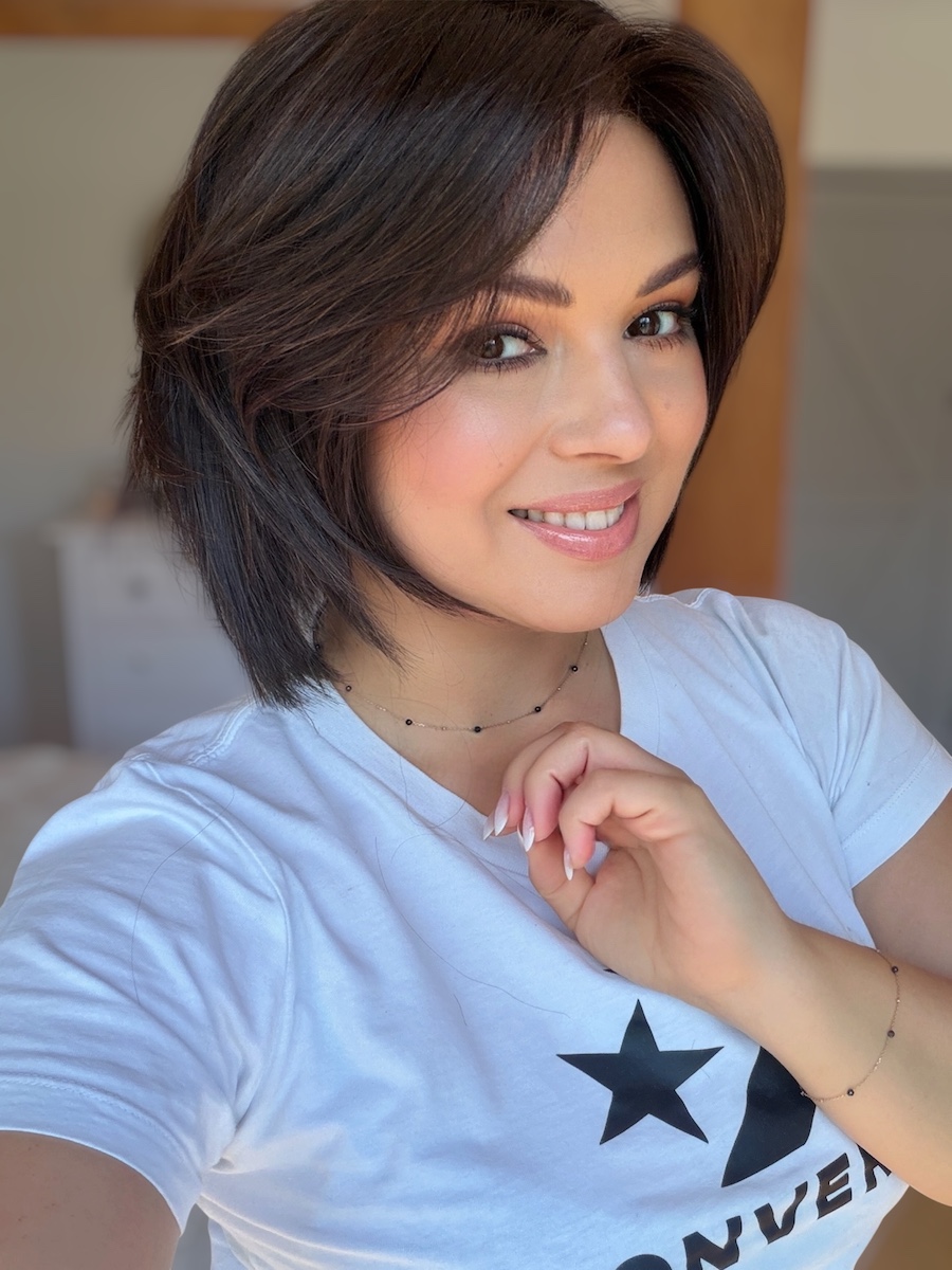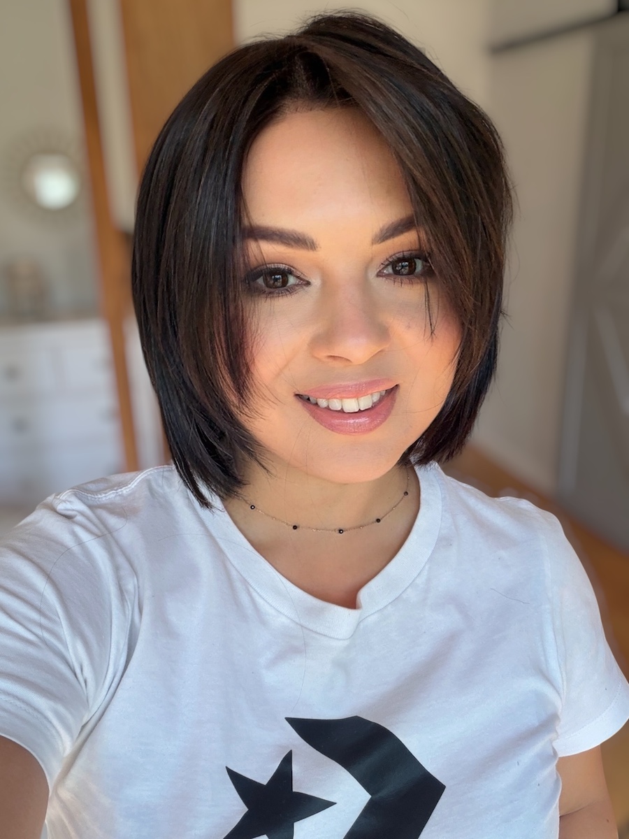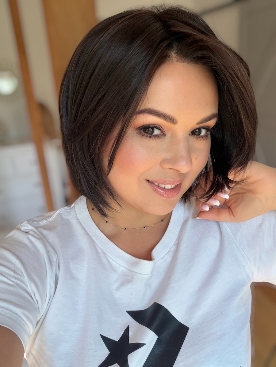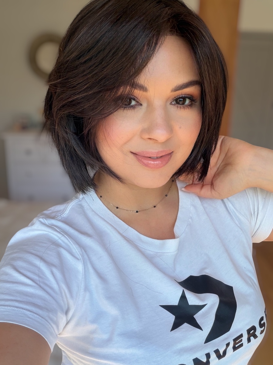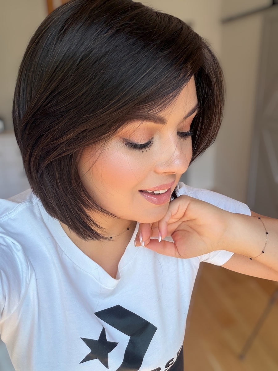 Model wyróżnia się lekką, warstwową fryzurą typu bob oraz subtelną grzywką, która miękko oprawia twarz i nadaje całości świeżości.
