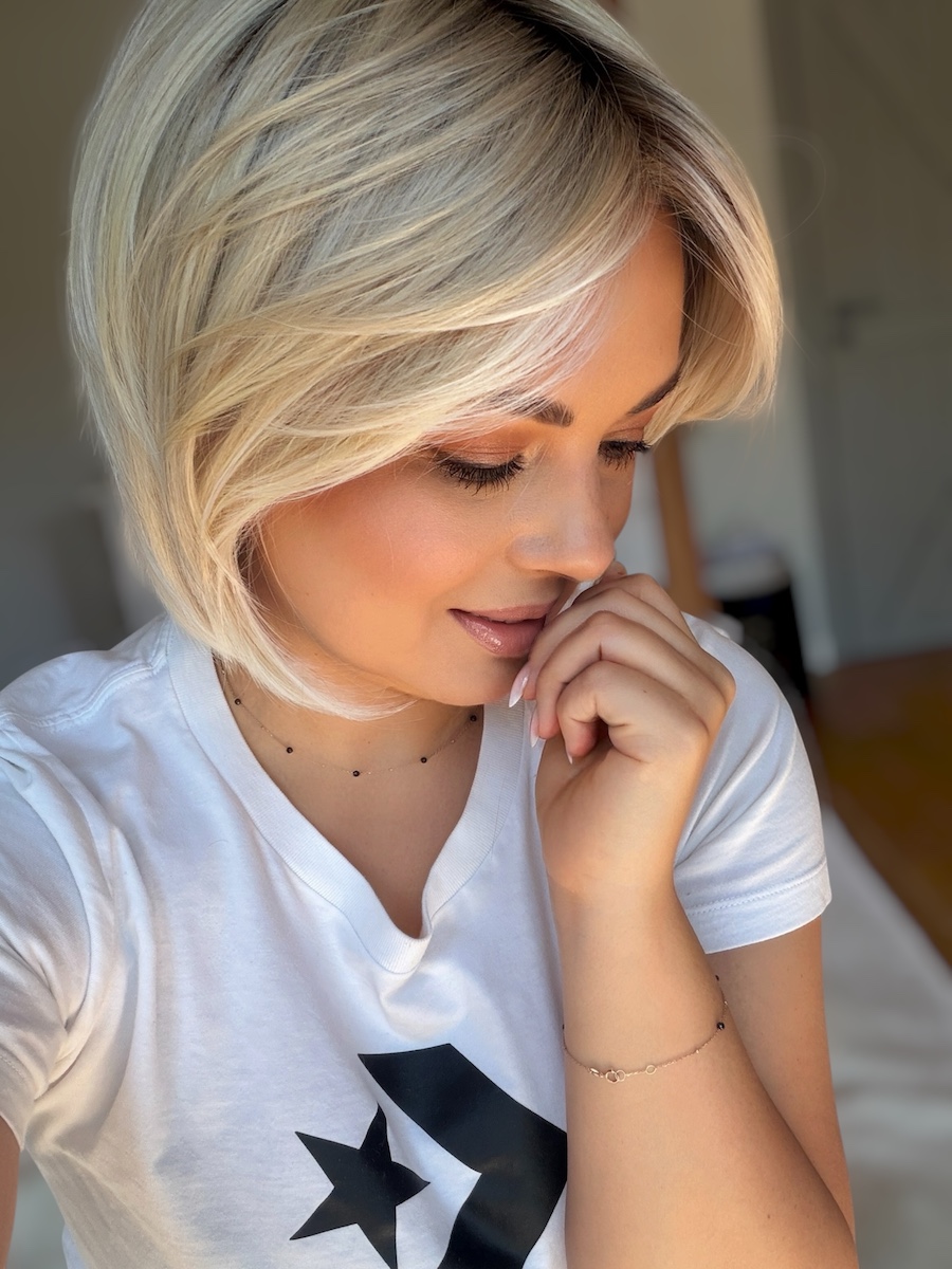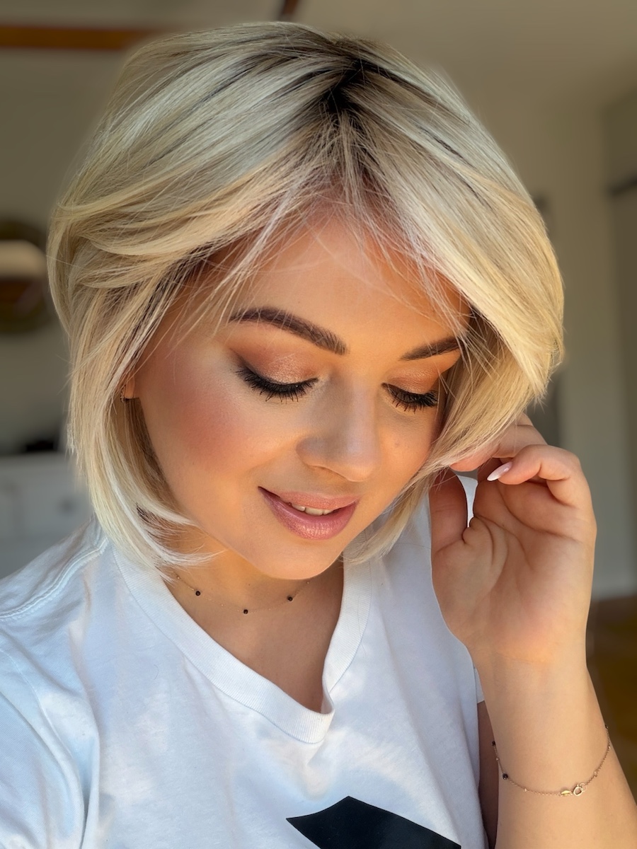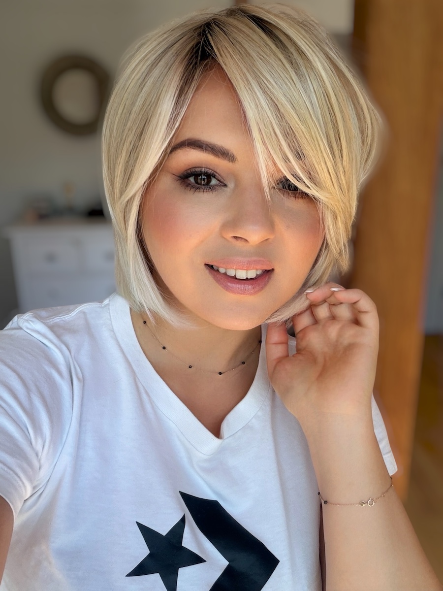 Model wyróżnia się lekką, warstwową fryzurą typu bob oraz subtelną grzywką, która miękko oprawia twarz i nadaje całości naturalnego charakteru.