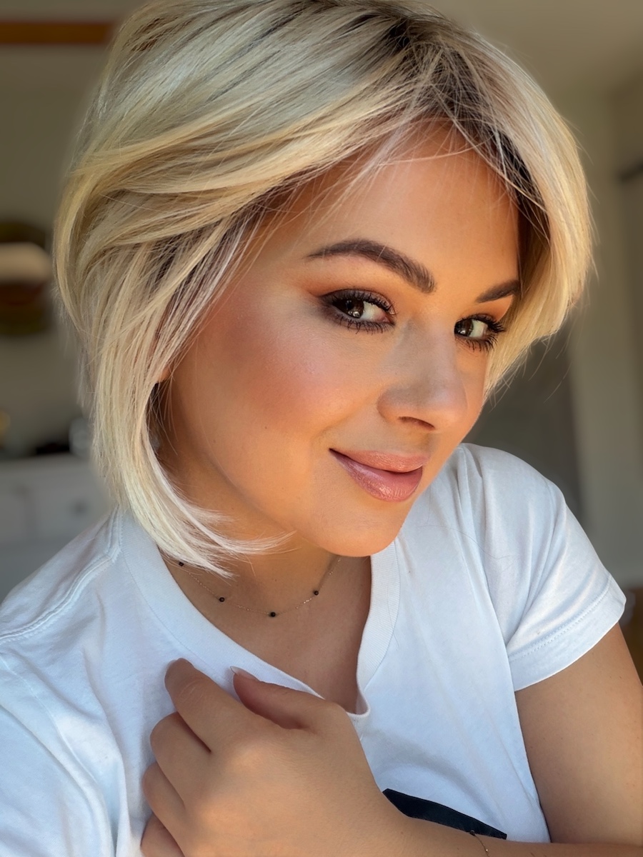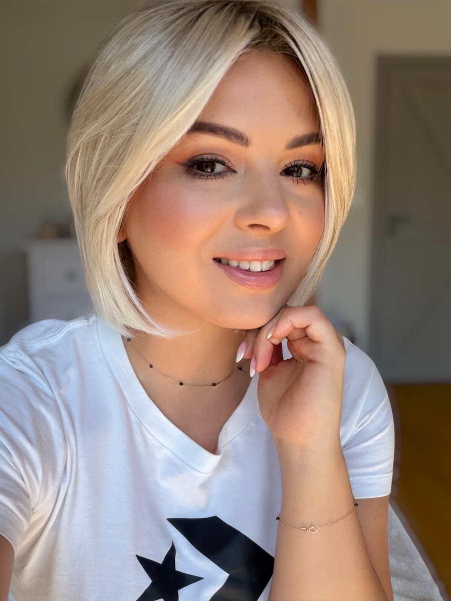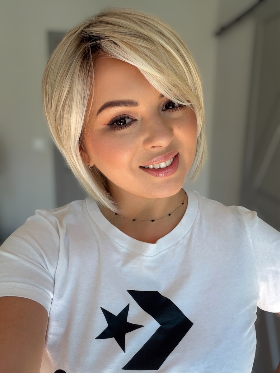 Model wyróżnia się lekką, warstwową fryzurą typu bob oraz subtelną grzywką, która miękko oprawia twarz i nadaje całości naturalnego charakteru.