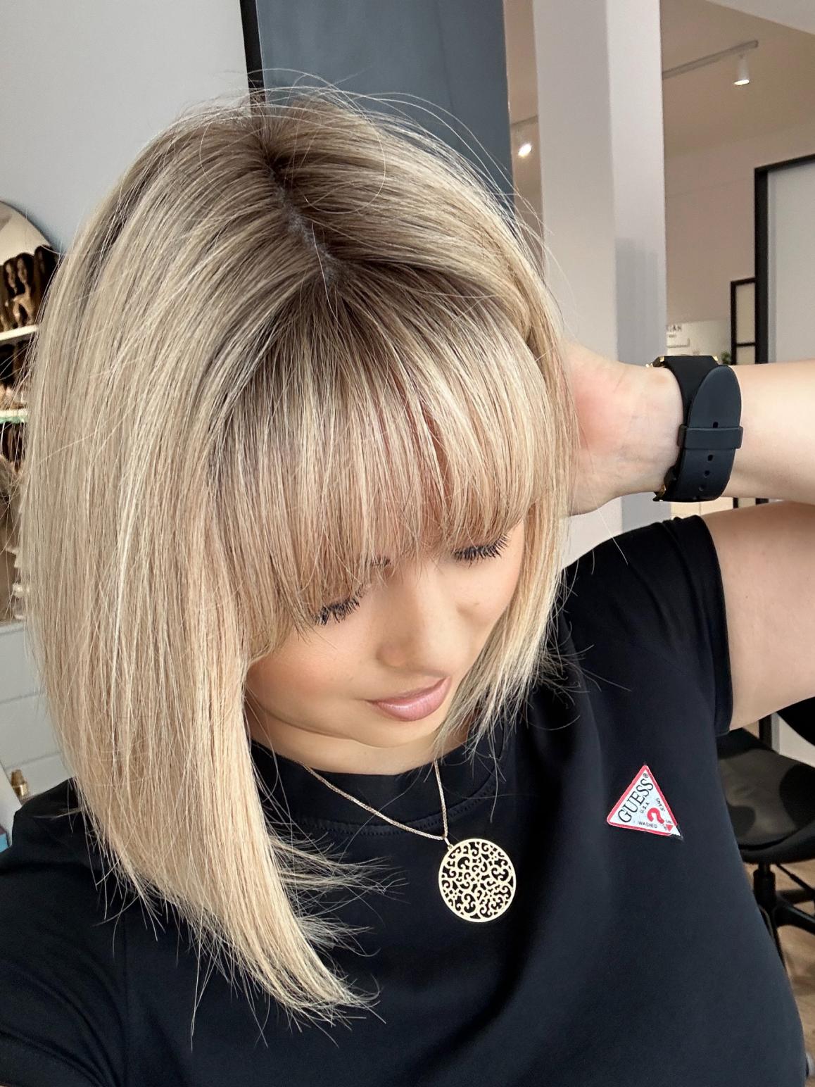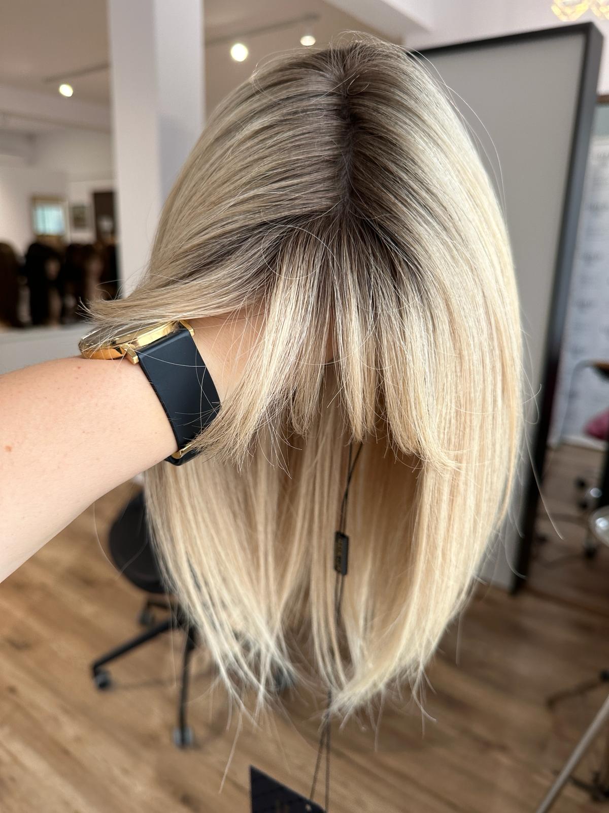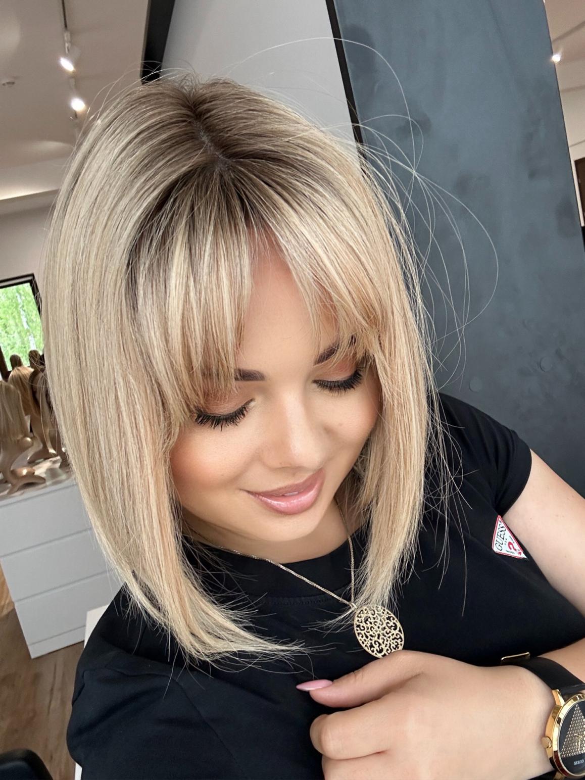 Kolor - jasny słoneczny stonowany blond z delikatnym odrostem, odcień chłodny.