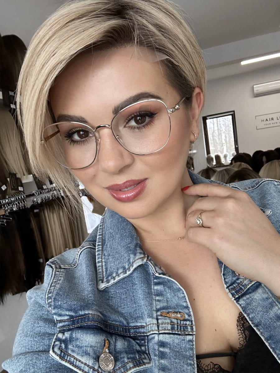 Wykonana z włosów naturalnych w kolorze blond z delikatnym odrostem.