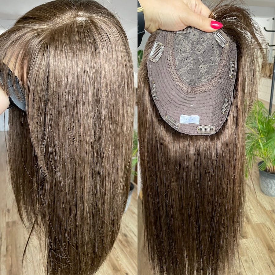 Topper Tina (tupet damski) wykonany z włosów europejskich o teksturze prostej, na bazie elastycznej 20x20 z wkładką z mikroskóry, mocowany na spinkach clip in.