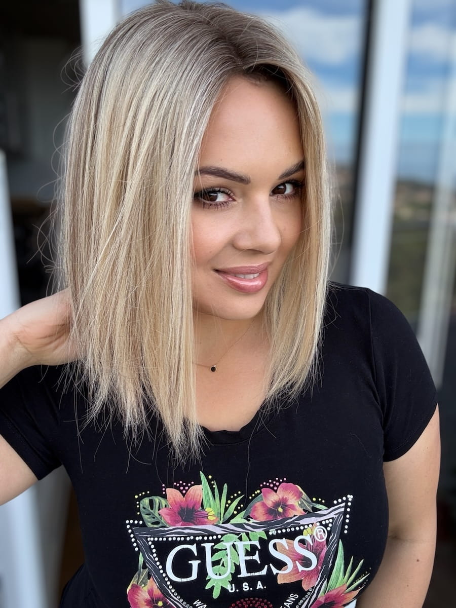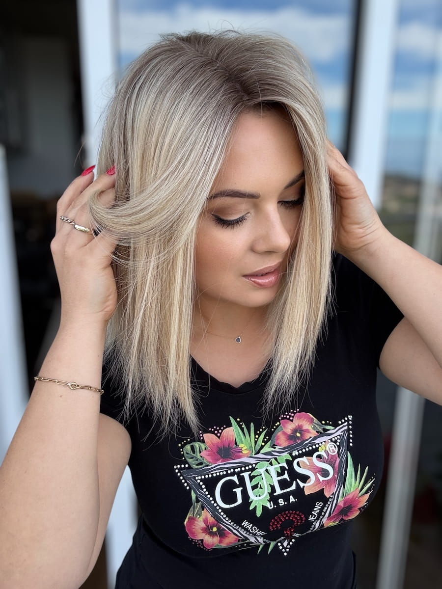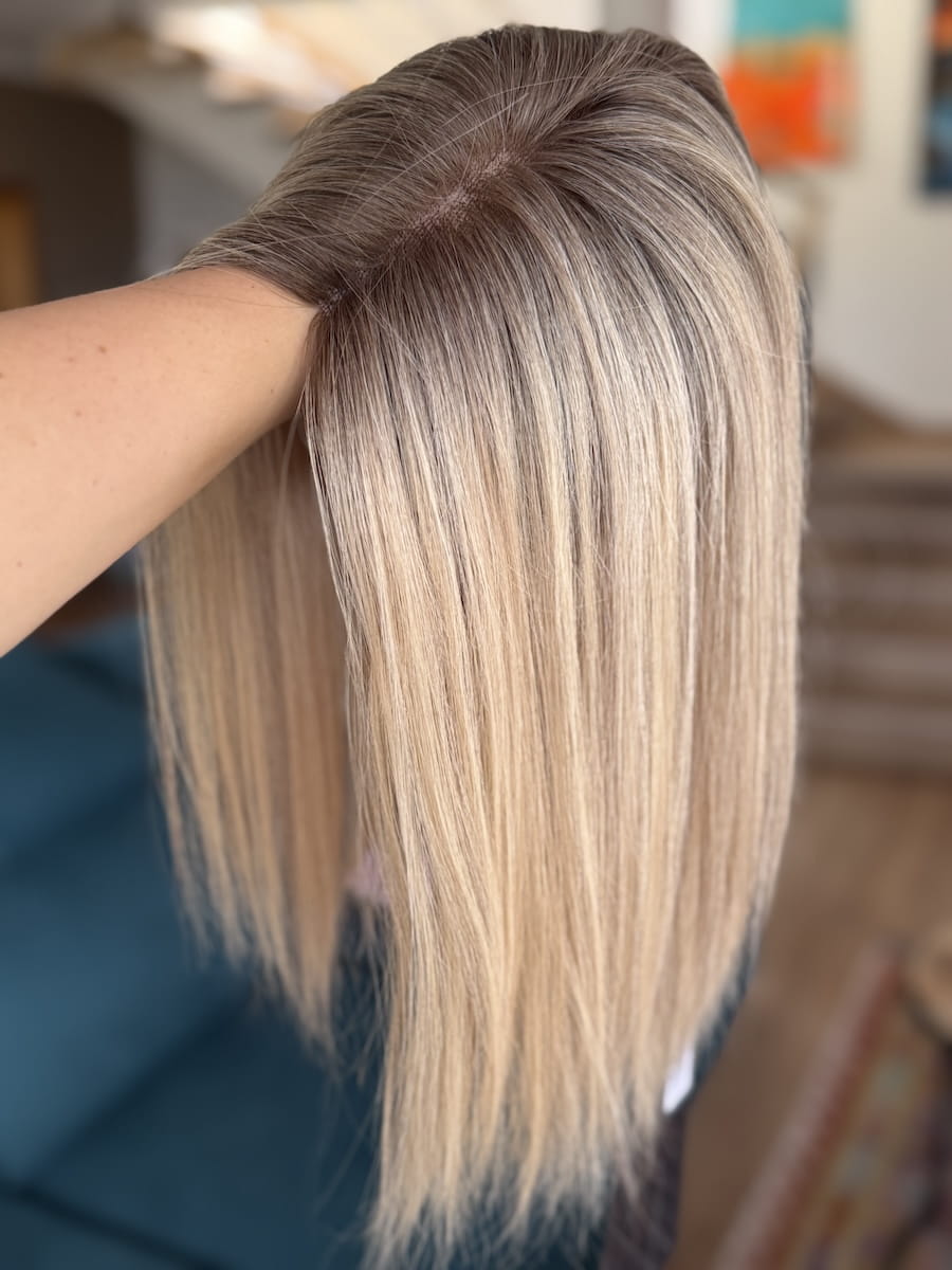 Prezentowany topper baleyage blond pozwoli Ci na eksperymentowanie z fryzurą. Możesz ją dowolnie kręcić i prostować (max temp. 160-170 stopni), a także swobodnie upinać, gdyż tupet został wykonany z wysokiej jakości włosów europejskich, które stanowią doskonały zagęszczacz. Topper wystarczy zapiąć do swoich włosów około 1 cm od początku przedziałka – tym sposobem uzyskamy najbardziej naturalny efekt.