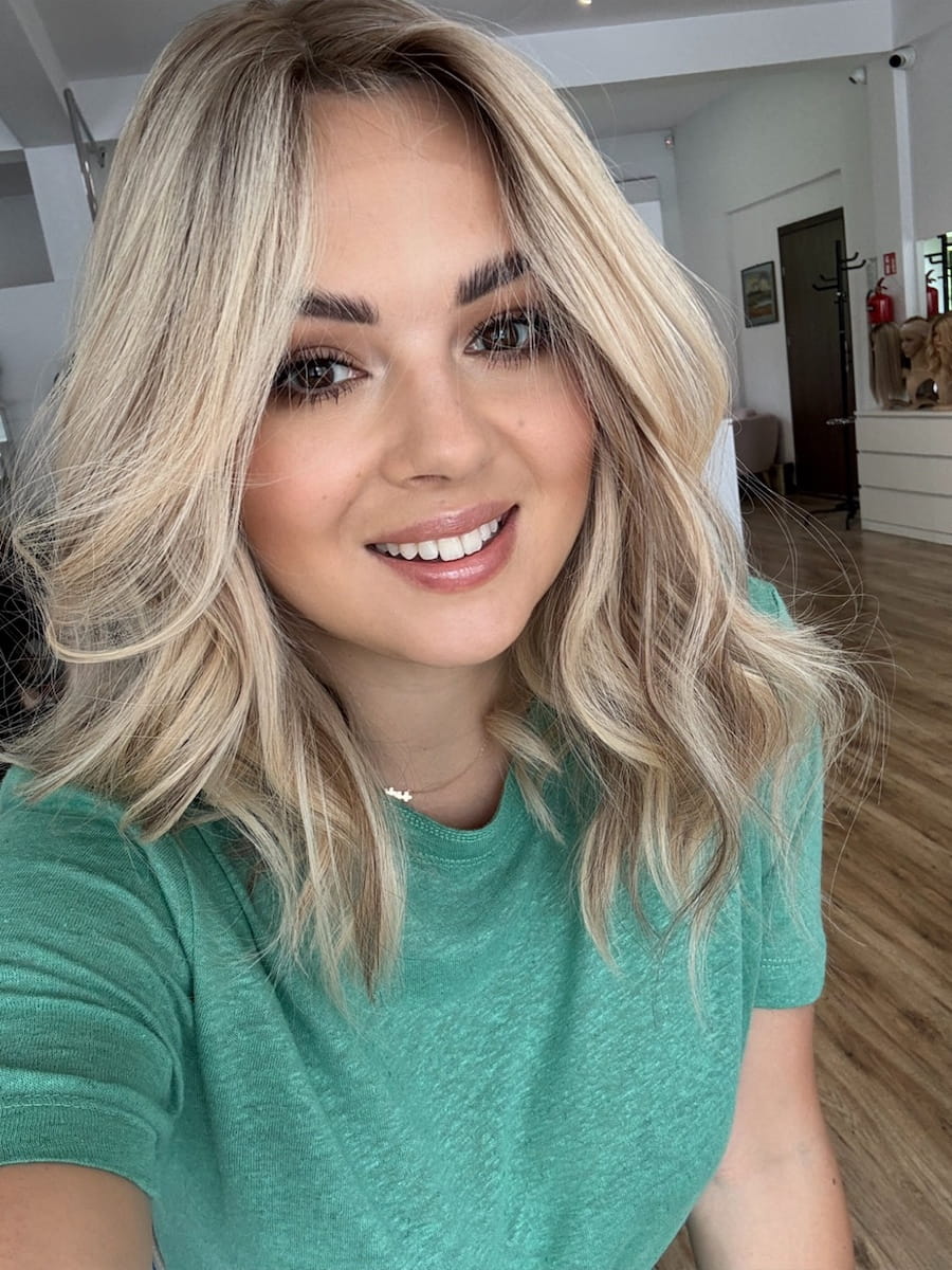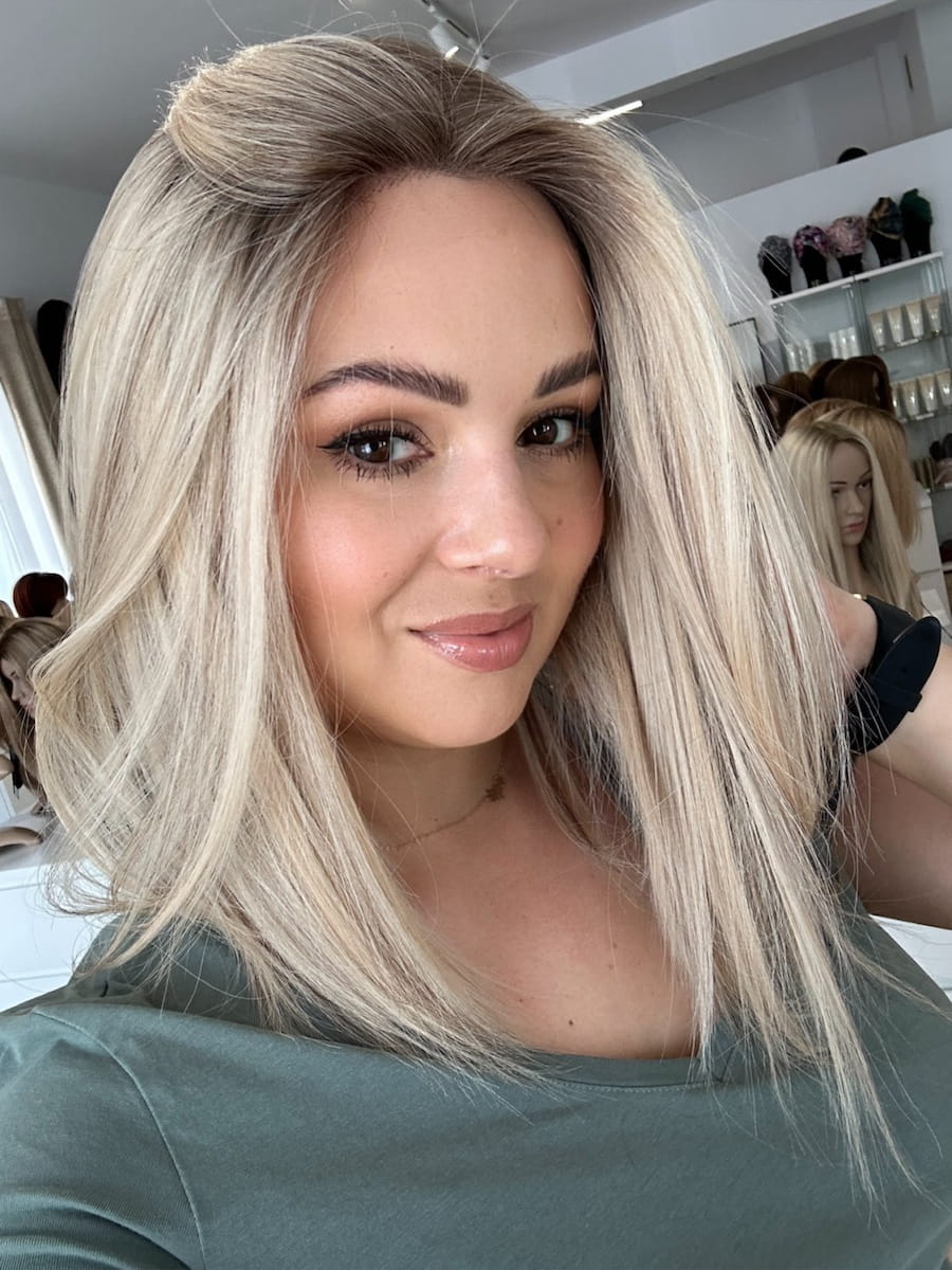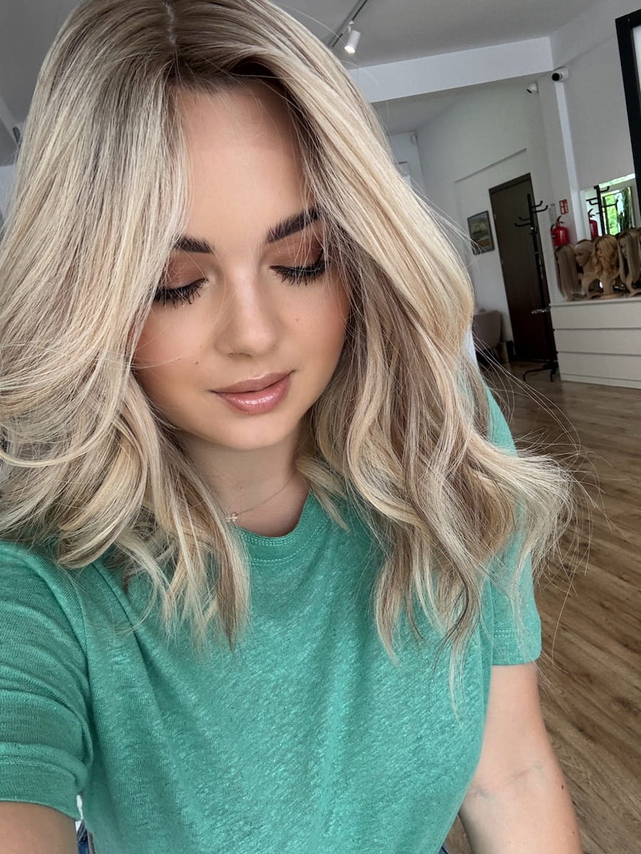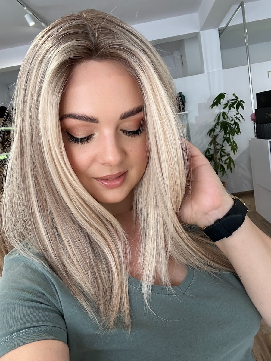 Kolor chłodny blond z pasemkami i chłodnym odrostem