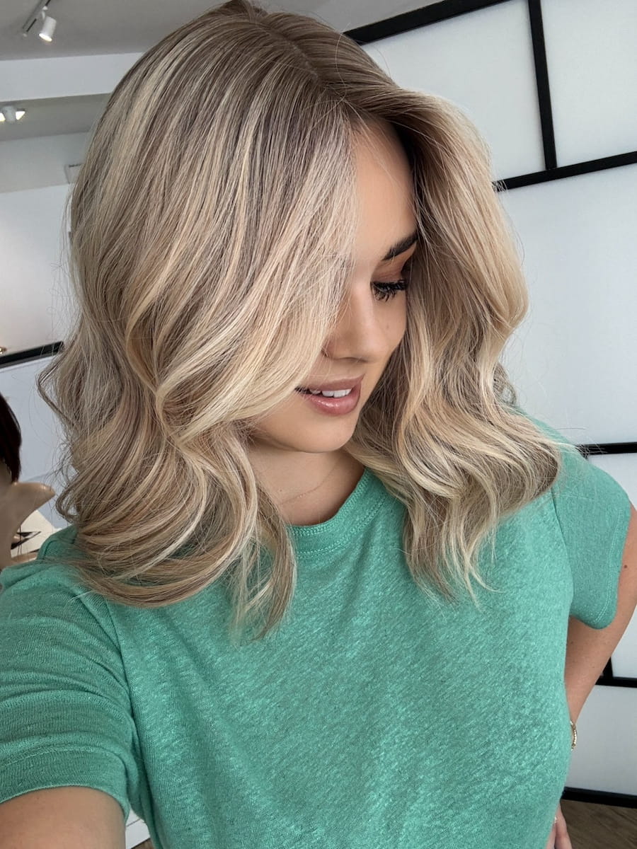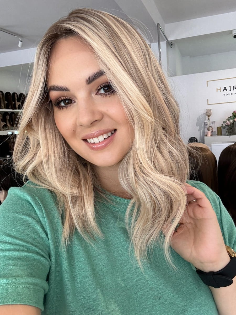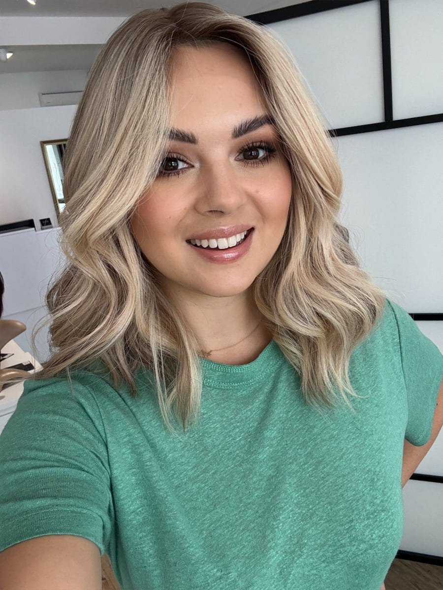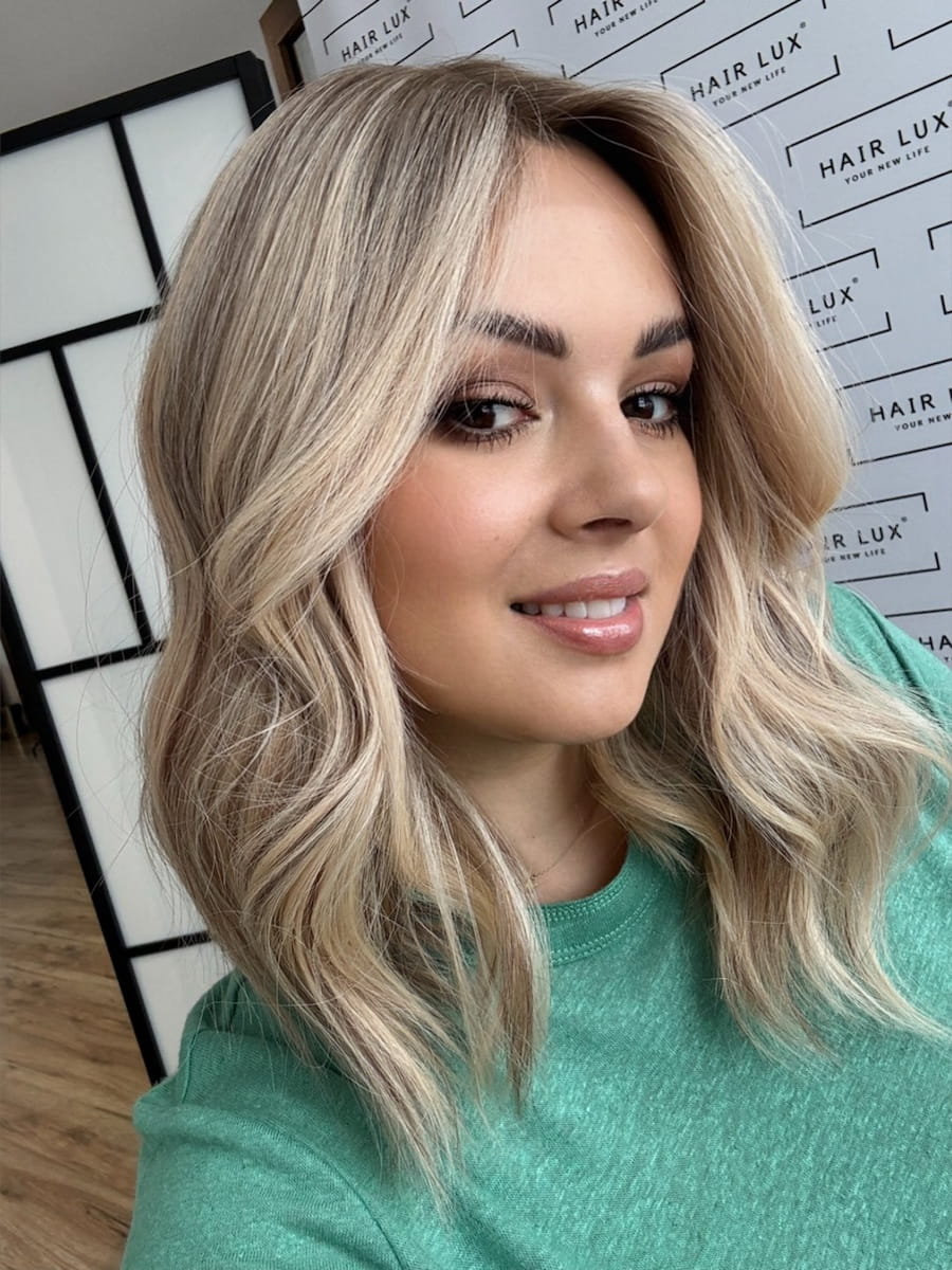 Kolor chłodny blond z pasemkami i chłodnym odrostem
