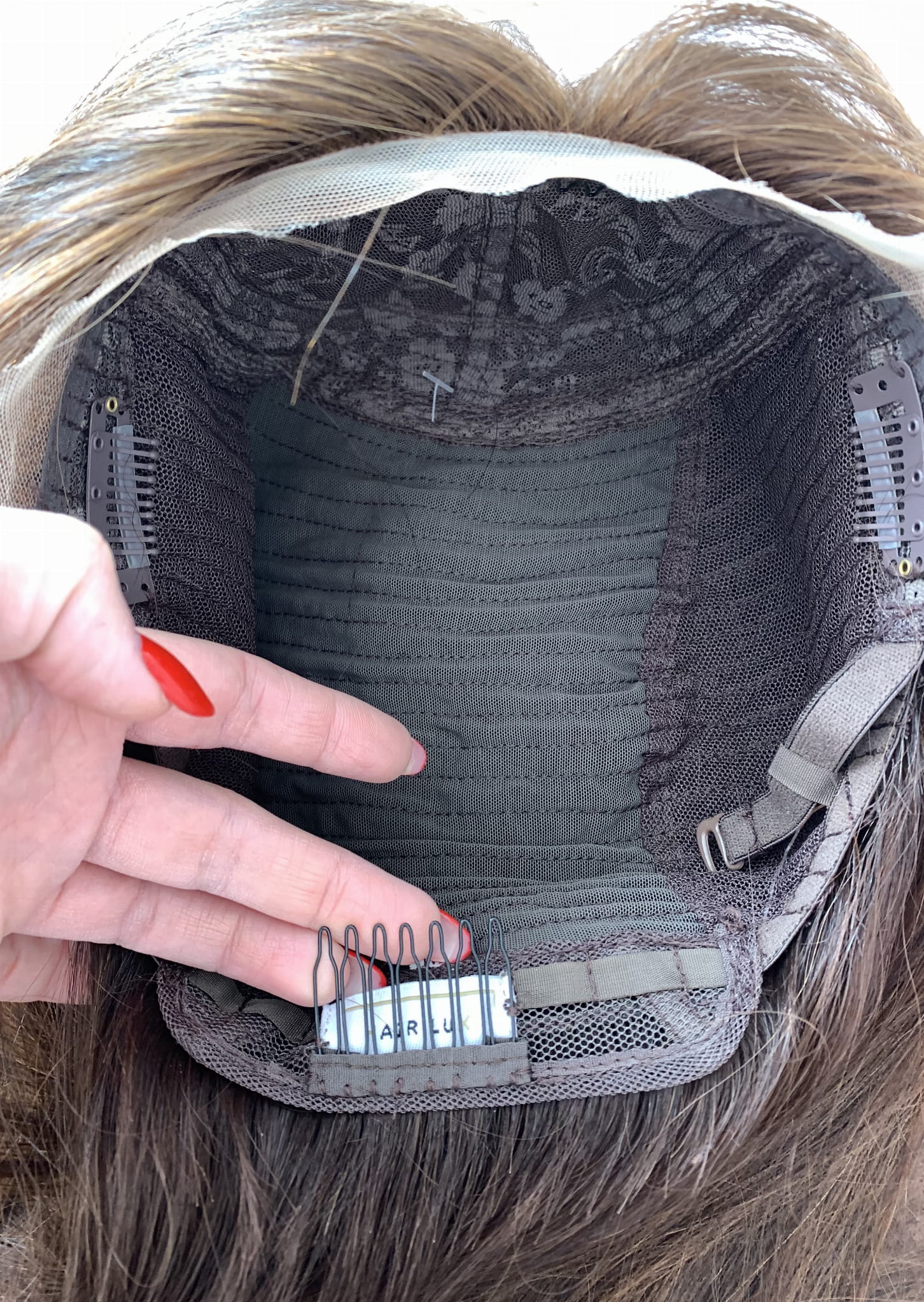 Elastyczny czepek z wbudowaną wkładką z mikrosórą o szerokości 12 cm, zapewnia możliwość zmiany przedziałka na bok.