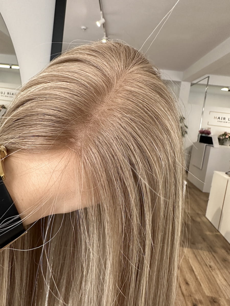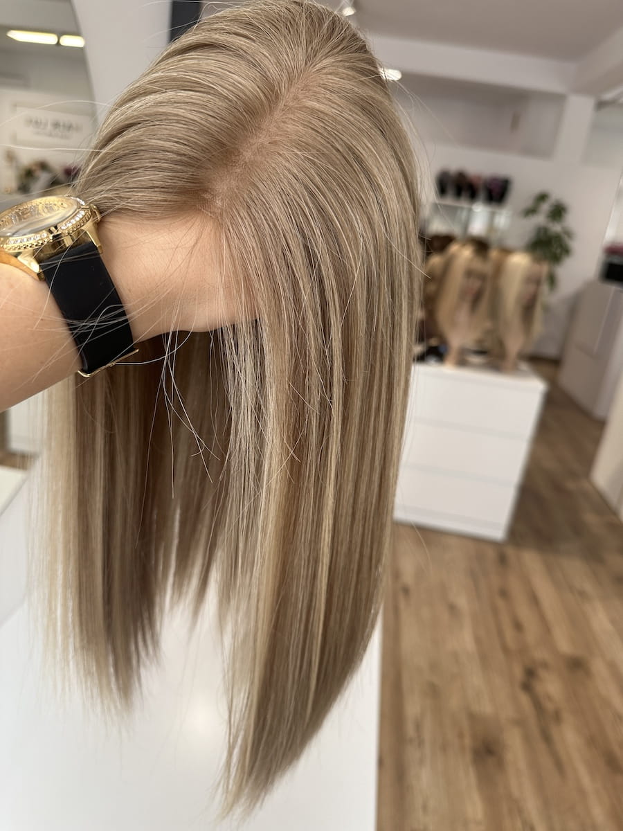 Delikatna baza lace z unikalnym podszyciem zapewnia płaskie, niewidoczne wykończenie oraz realistyczny efekt przedziałka. Topper perfekcyjnie stapia się ze skórą głowy, tworząc efekt naturalnych włosów.
