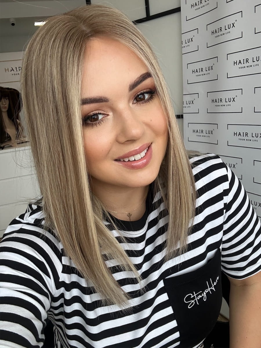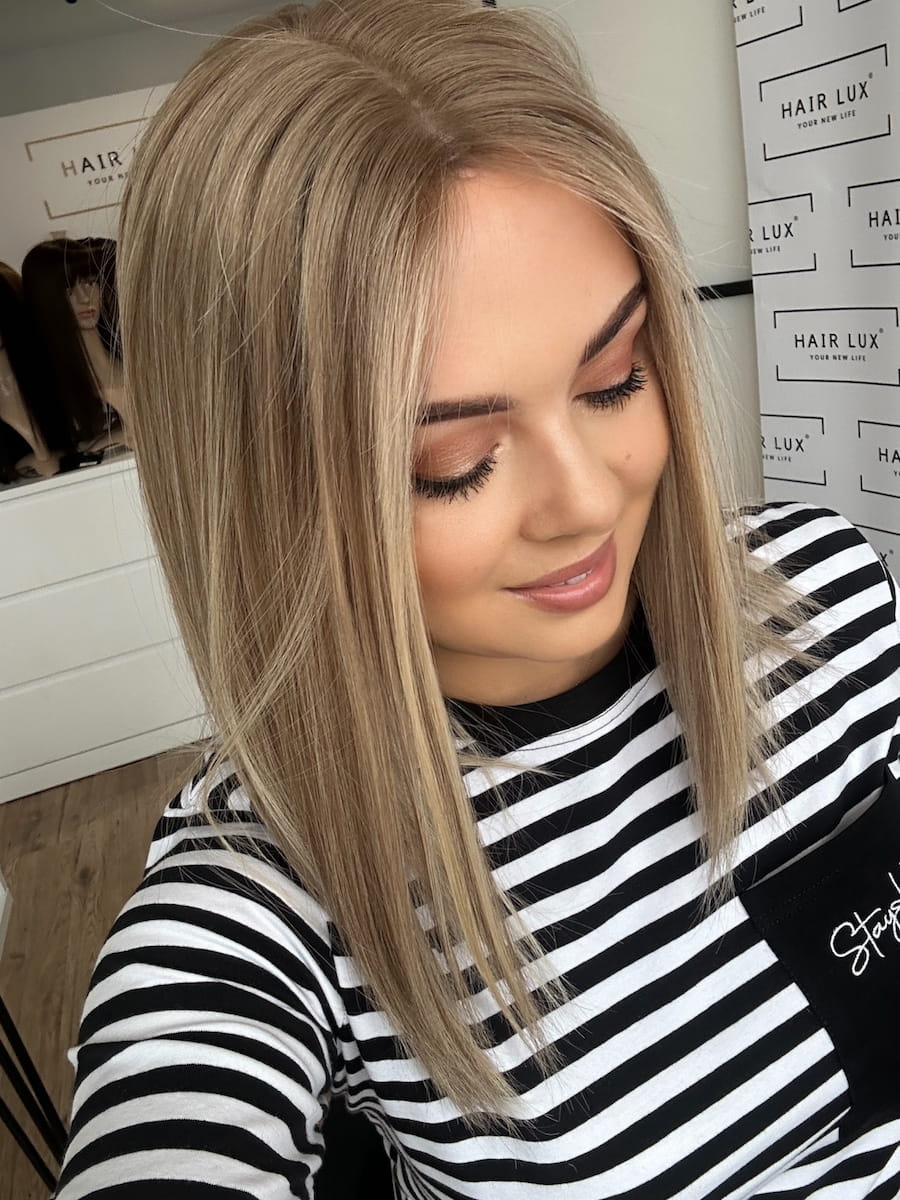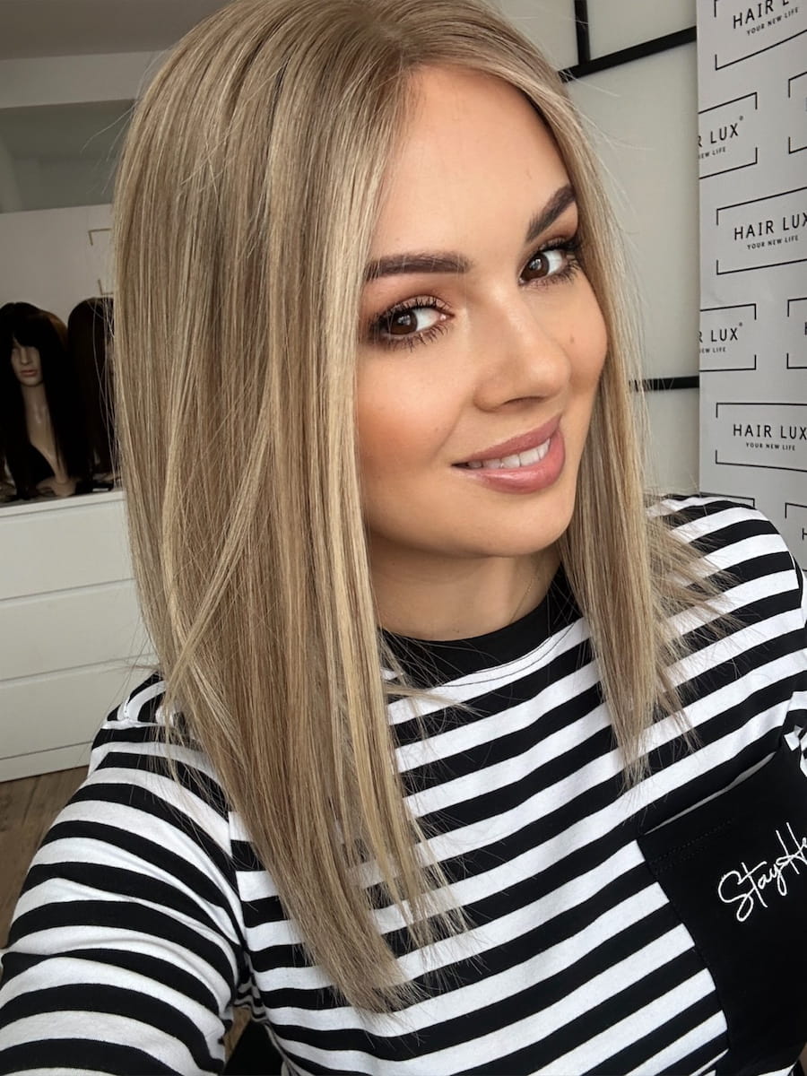 Kolor baleyage blond nadaje fryzurze lekkości i świeżości – subtelne przejścia i refleksy rozświetlają twarz i dają efekt profesjonalnej koloryzacji bez konieczności farbowania własnych włosów.