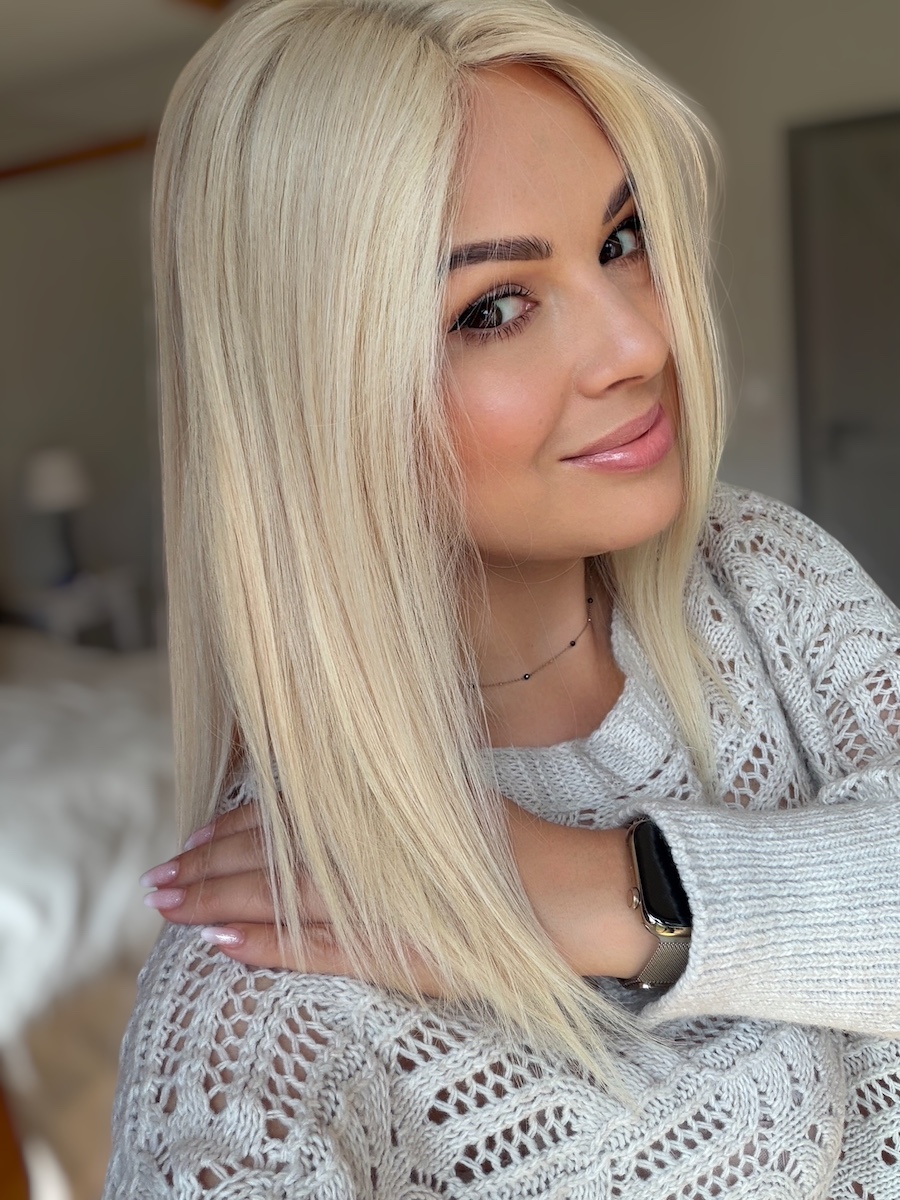 To bardzo jasny blond, który wpada lekko w złocisty ton, dzięki czemu wygląda miękko i naturalnie – bez efektu „szarości” czy zgaszenia. Kolor pięknie odbija światło i dodaje twarzy świeżości oraz blasku.
