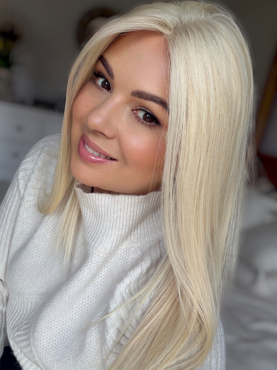 To bardzo jasny blond, który wpada lekko w złocisty ton, dzięki czemu wygląda miękko i naturalnie – bez efektu „szarości” czy zgaszenia. Kolor pięknie odbija światło i dodaje twarzy świeżości oraz blasku.