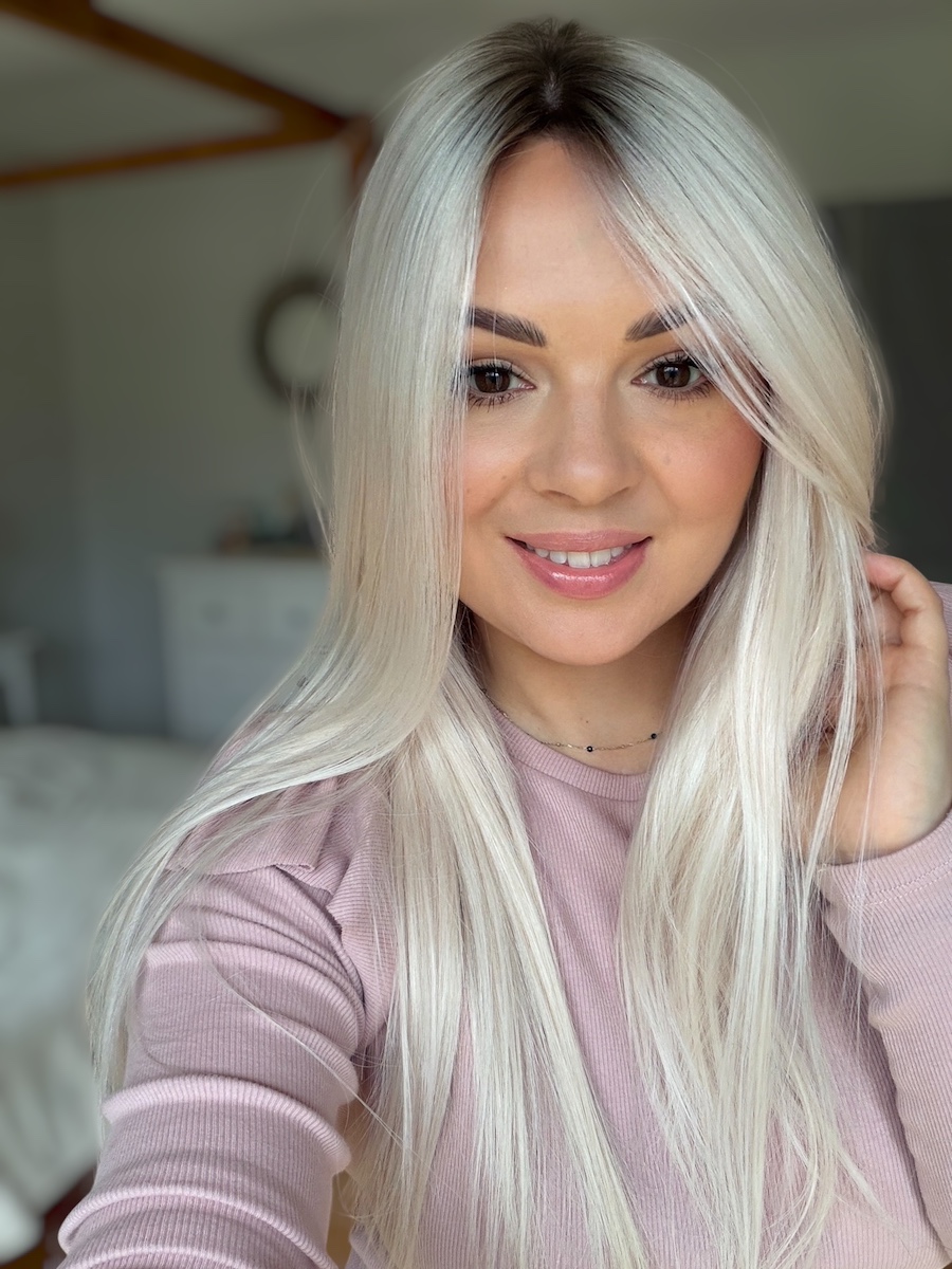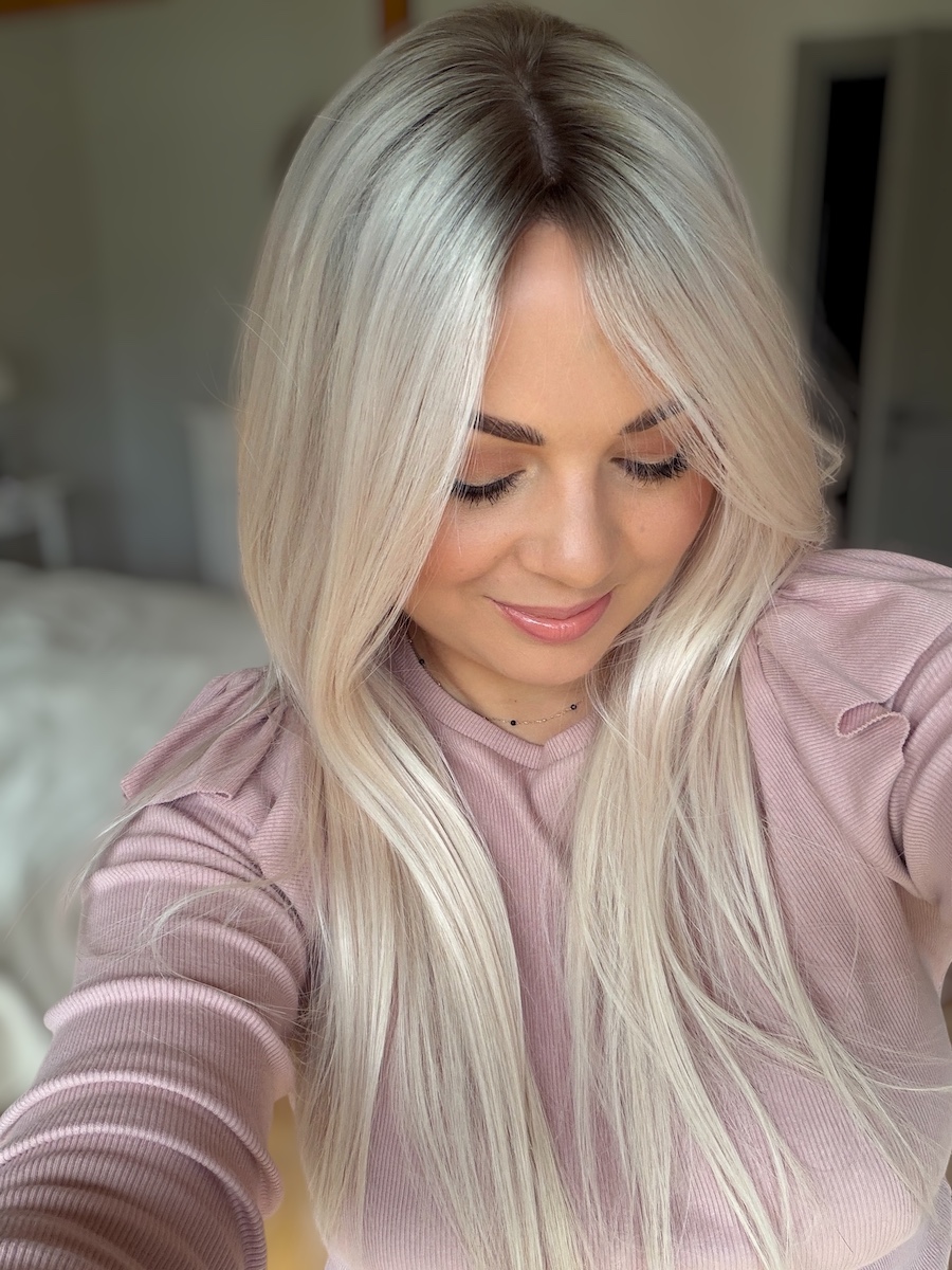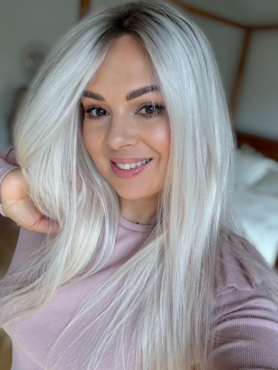 To odcień, który pięknie odbija światło i wyróżnia się na tle klasycznych blondów – jest nowoczesny, lekko chłodny, a jednocześnie bardzo miękki w odbiorze.