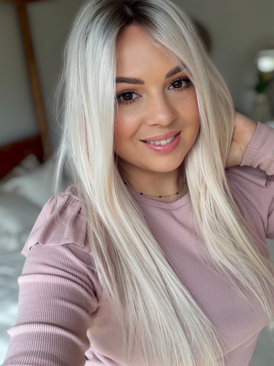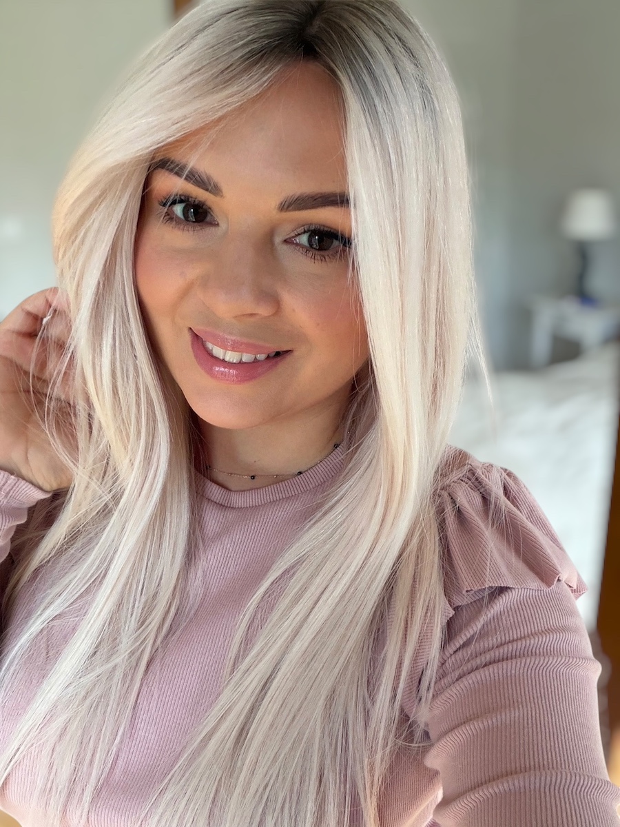 • kolor: jasny blond z delikatnym różowym tonem i ciemnym odrostem